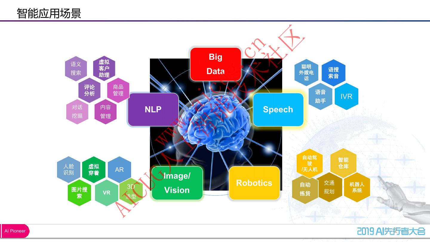 3 . 智能应用场景 区 术 cn Big 社 虚拟 技 g. 语义 聪明 搜索 客户 助理 Data 外拨电 语搜 索音 话 能 cu 评论 商品 分析 管理 语音 IVR 智 ai 助手 对话 内容 NLP Speech 挖掘 管理 工 . ww 人脸 虚拟 G人 w 自动驾 驶 智能 仓库 AR /无人机 识别 穿着 Image/ 3D Robotics 自动 交通 机器人 CU 图片搜 VR Vision 拣货 规划 系统 索 造型 AI AI Pioneer 2