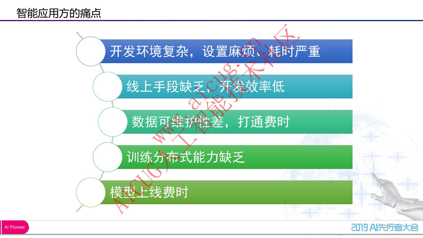 4 . 智能应用方的痛点 区 术 cn 开发环境复杂,设置麻烦、耗时严重 社 技 g. 能 cu 线上手段缺乏,开发效率低 智 ai 工 . 数据可维护性差,打通费时 ww G人 w 训练分布式能力缺乏 CU 模型上线费时 AI AI Pioneer 3