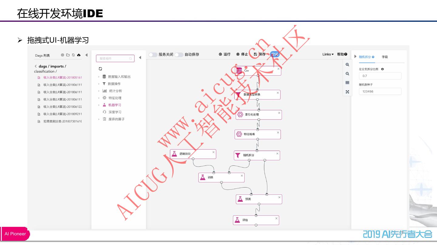8 . 在线开发环境IDE Ø 拖拽式UI-机器学习 区 术 cn 社 技 g. 能 cu 智 ai 工 . ww G人 w CU AI AI Pioneer 7