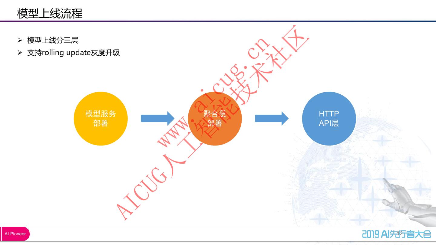 13 . 模型上线流程 Ø 模型上线分三层 区 术 cn Ø 支持rolling update灰度升级 社 技 g. 能 cu 智 ai 模型服务 聚合层 HTTP 工 . 部署 部署 API层 ww G人 w CU AI AI Pioneer 12