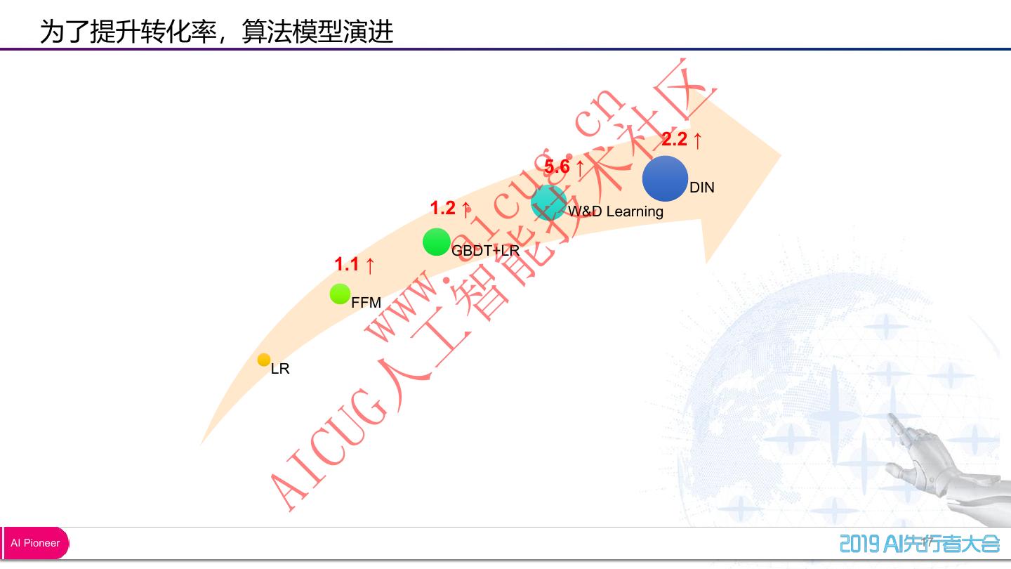 18 . 为了提升转化率,算法模型演进 区 术 cn 社 2.2 ↑ 技 g. 5.6 ↑ DIN 能 cu 1.2 ↑ W&D Learning 智 ai GBDT+LR 1.1 ↑ 工 . ww FFM LR G人 w CU AI AI Pioneer 17