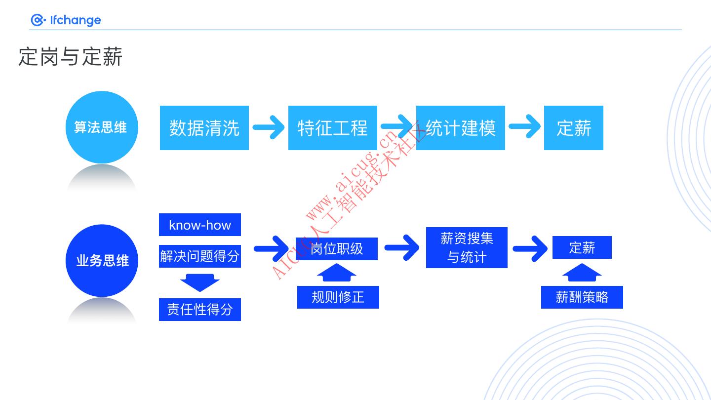 13 .定岗与定薪 算法思维 数据清洗 特征⼯工程 统计建模 定薪 区 术 cn 社 技 g. 能 cu 智 ai 工 . ww G人 w know-how 业务 薪资搜集 岗位职级 定薪 业务思维 解决问题得分 与统计 CU 驱动 AI 规则修正 薪酬策略略 责任性得分