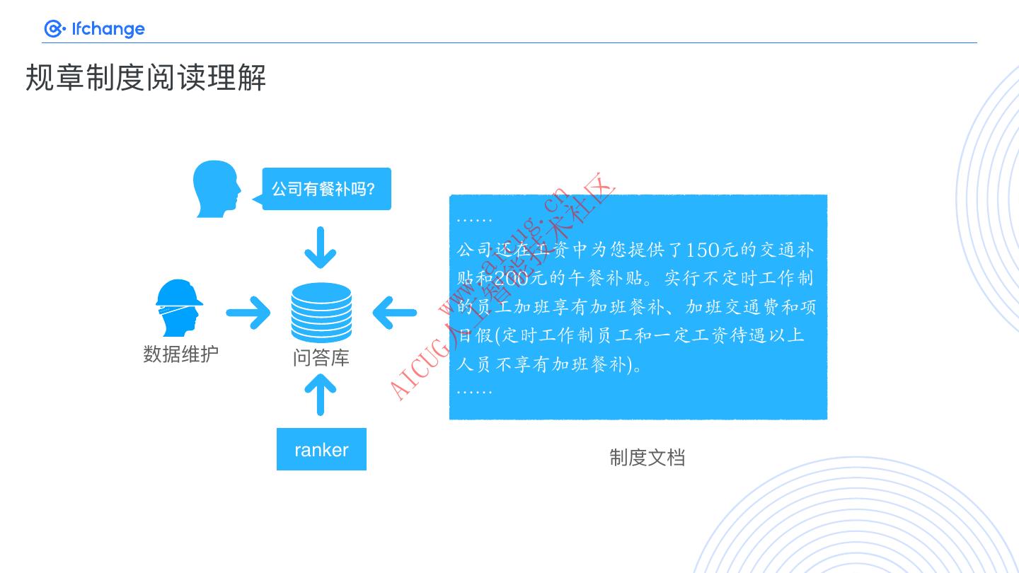 14 .规章制度阅读理理解 公司有餐补吗? 区 术 cn 社 …… 技 g. 能 cu 公司还在工资中为您提供了150元的交通补 智 ai 贴和200元的午餐补贴。实行不定时工作制 工 . ww 的员工加班享有加班餐补、加班交通费和项 G人 w 目假(定时工作制员工和一定工资待遇以上 数据维护 问答库 人员不享有加班餐补)。 CU AI …… ranker 制度⽂文档