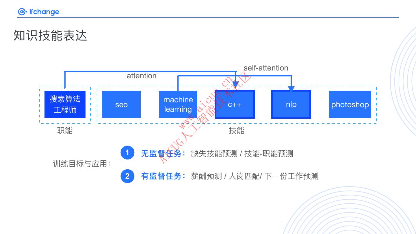 18 .知识技能表达 self-attention attention 区 术 cn 社 技 g. 搜索算法 machine 能 cu seo c++ nlp photoshop ⼯工程师 learning 智 ai 工 . ww 职能 技能 G人 w CU 1 ⽆无监督任务: 缺失技能预测 / 技能-职能预测 训练⽬目标与应⽤用: AI 2 有监督任务: 薪酬预测 / ⼈人岗匹配/ 下⼀一份⼯工作预测