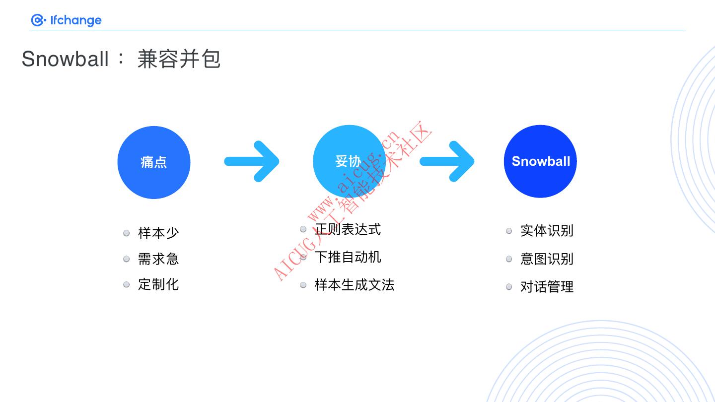 19 .Snowball :兼容并包 区 术 cn 社 技 g. 痛点 妥协 Snowball 能 cu 智 ai 工 . ww G人 w 样本少 正则表达式 实体识别 需求急 下推⾃自动机 意图识别 CU 定制化 AI 样本⽣生成⽂文法 对话管理理