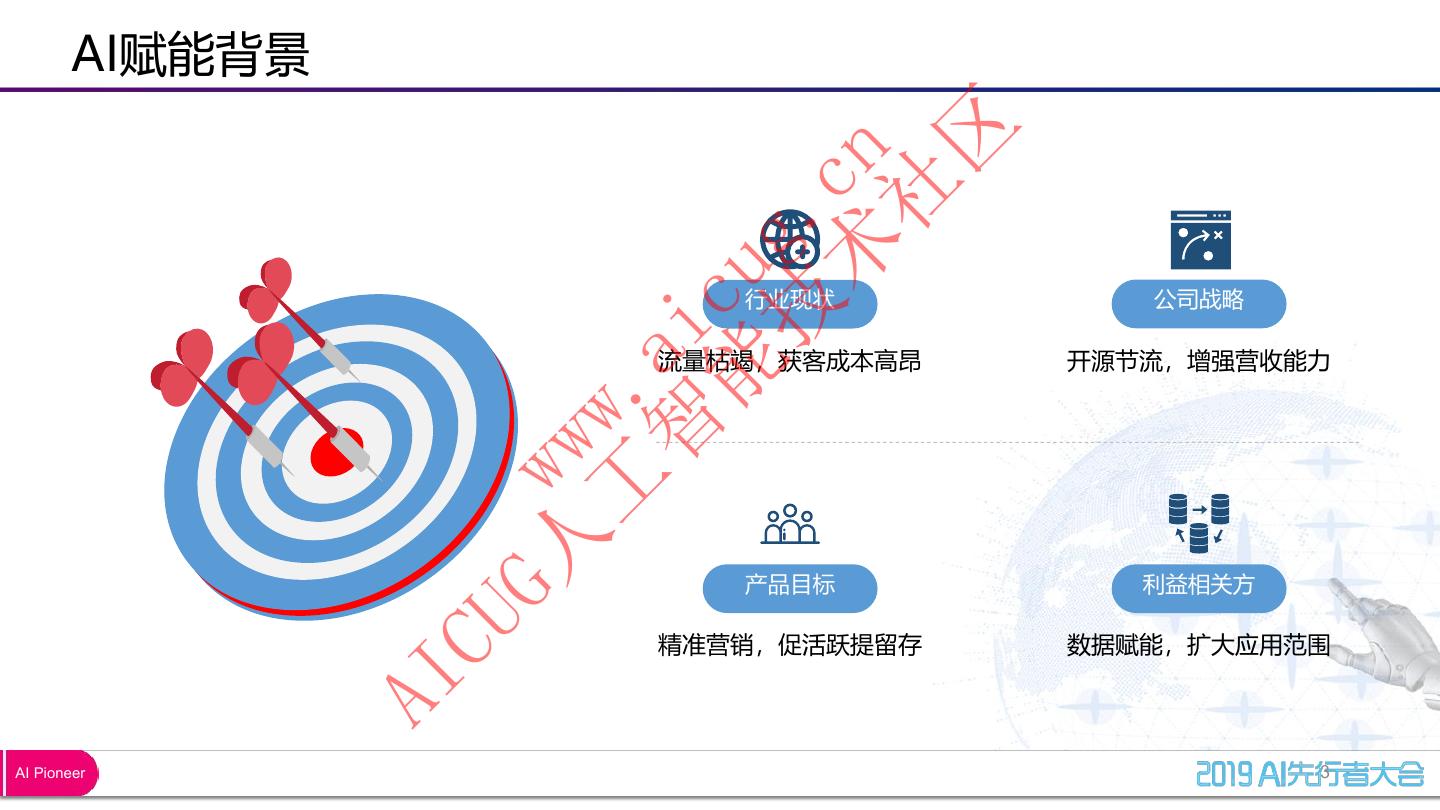 4 . AI赋能背景 区 术 cn 社 技 g. 能 cu 行业现状 公司战略 智 ai 流量枯竭,获客成本高昂 开源节流,增强营收能力 工 . ww G人 w 产品目标 利益相关方 CU 精准营销,促活跃提留存 数据赋能,扩大应用范围 AI AI Pioneer 3