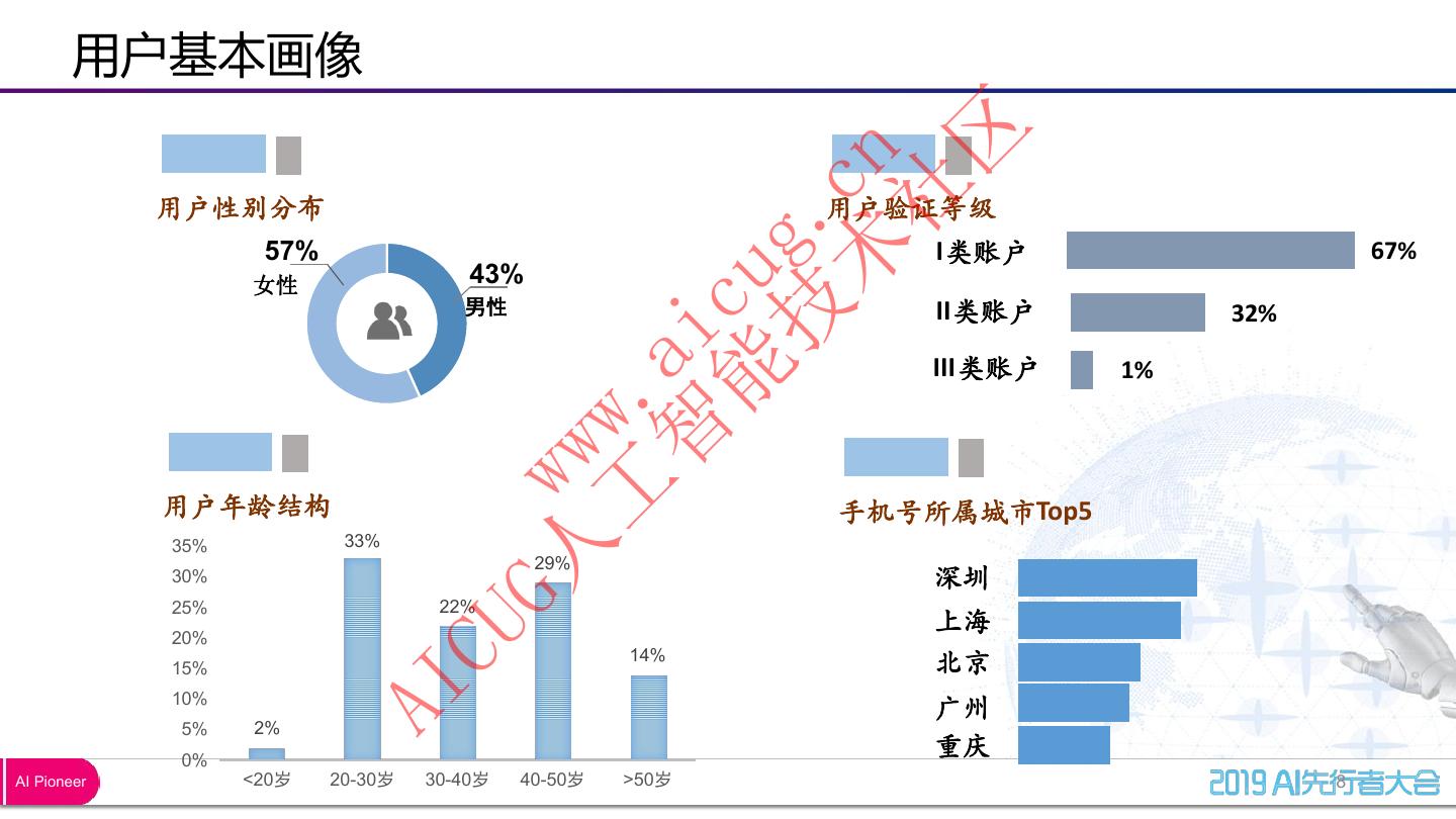 9 . 用户基本画像 区 术 cn 社 用户性别分布 用户验证等级 技 g. 57% I类账户 67% 43% 能 cu 女性 男性 II类账户 32% 智 ai III类账户 1% 工 . ww 用户年龄结构 35% 33% G人 w 29% 手机号所属城市Top5 30% 深圳 25% 22% 上海 CU 20% 14% 15% 北京 AI 10% 广州 5% 2% 0% 重庆 AI Pioneer <20岁 20-30岁 30-40岁 40-50岁 >50岁 8