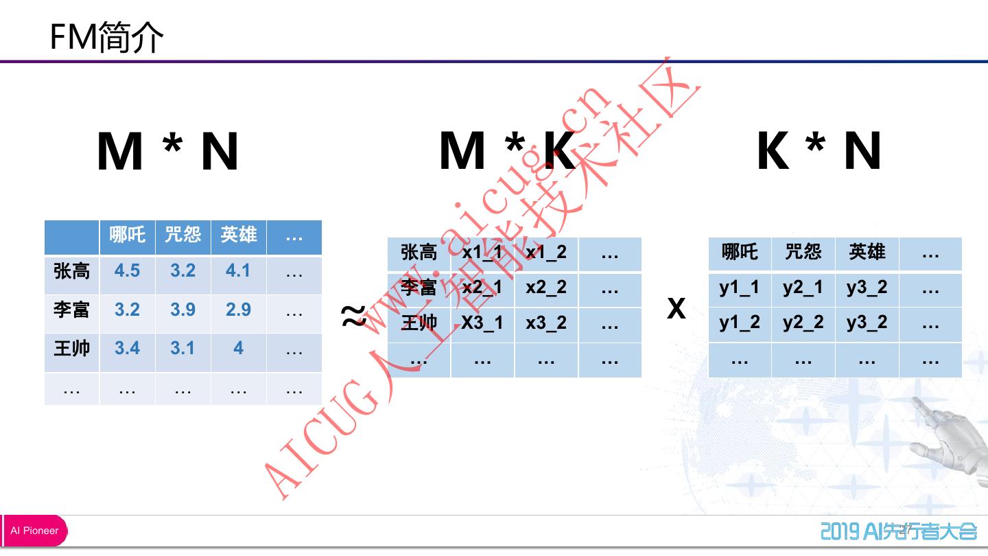 28 . FM简介 区 术 cn M*N M*K K*N 社 技 g. 能 cu … 智 ai 哪吒 咒怨 英雄 张高 x1_1 x1_2 … 哪吒 咒怨 英雄 … 张高 4.5 5 3.2 4.1 4 … 工 . x2_1 x2_2 … y1_1 y2_1 y3_2 … ~ 李富 ww X 李富 3.2 3.9 4 2.9 … ~ 王帅 X3_1 x3_2 … y1_2 y2_2 y3_2 … 王帅 3.4 5 3.1 3 4 … G人 w… … … … … … … … … … … … … CU AI AI Pioneer 27