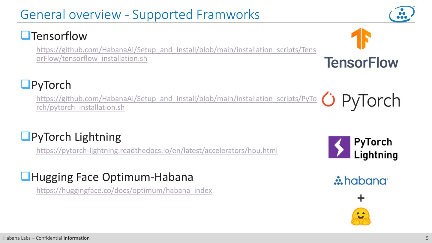 5 . General overview - Supported Framworks ❑Tensorflow https://github.com/HabanaAI/Setup_and_Install/blob/main/installation_scripts/Tens orFlow/tensorflow_installation.sh ❑PyTorch https://github.com/HabanaAI/Setup_and_Install/blob/main/installation_scripts/PyTo rch/pytorch_installation.sh ❑PyTorch Lightning https://pytorch-lightning.readthedocs.io/en/latest/accelerators/hpu.html ❑Hugging Face Optimum-Habana https://huggingface.co/docs/optimum/habana_index Habana Labs – Confidential Information 5