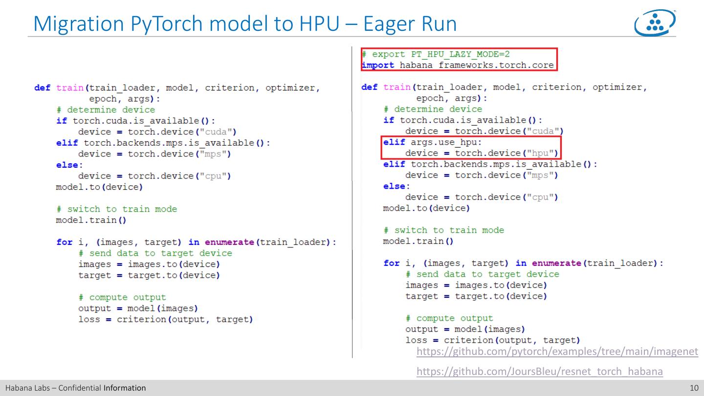 9 . Migration PyTorch model to HPU – Base Codes https://github.com/pytorch/examples/tree/main/imagenet https://github.com/JoursBleu/resnet_torch_habana Habana Labs – Confidential Information 9