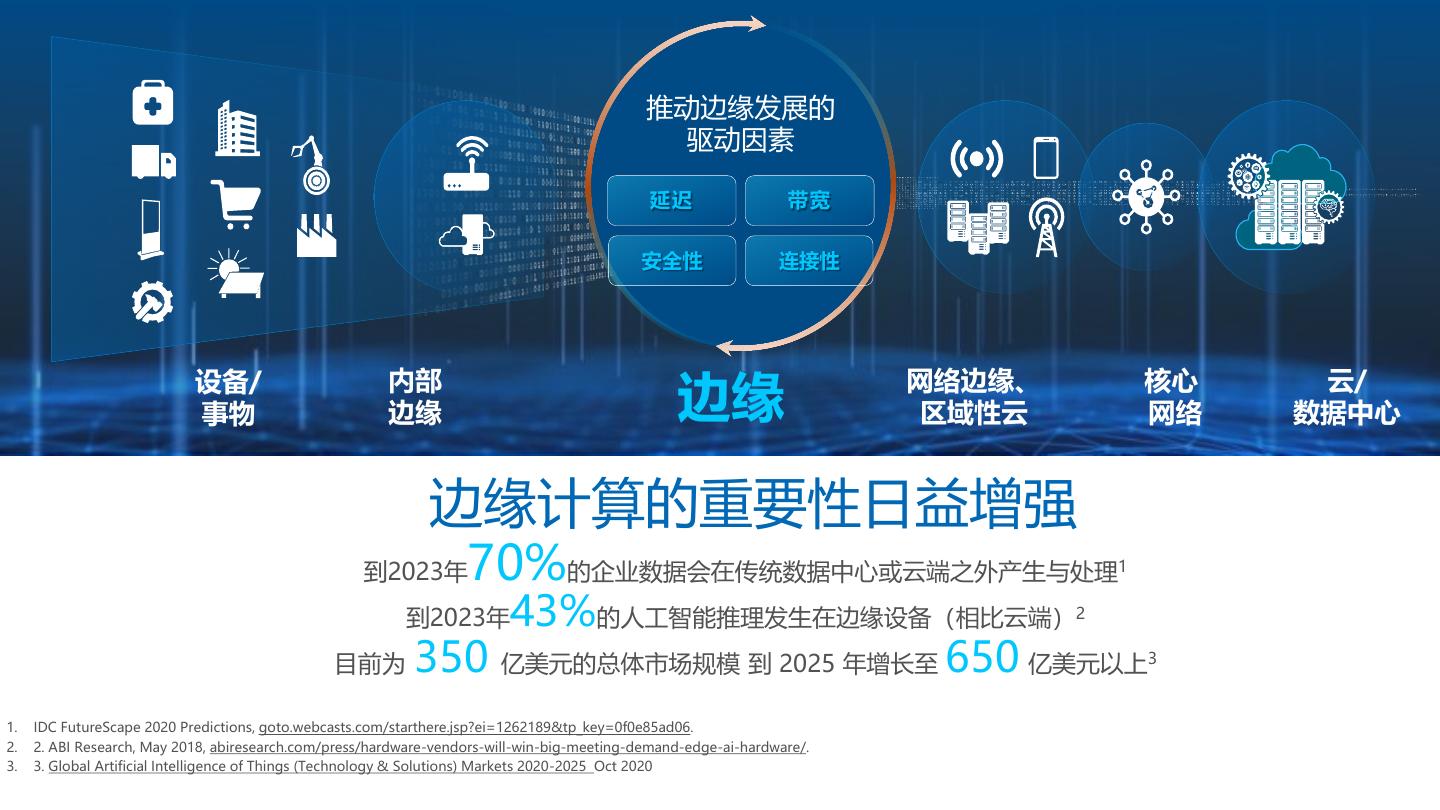 4 . 推动边缘发展的 驱动因素 延迟 带宽 安全性 连接性 设备/ 事物 内部 边缘 边缘 网络边缘、 区域性云 核心 网络 云/ 数据中心 边缘计算的重要性日益增强 到2023年 70%的企业数据会在传统数据中心或云端之外产生与处理 1 43%的人工智能推理发生在边缘设备(相比云端) 到2023年 2 目前为 350 亿美元的总体市场规模 到 2025 年增长至 650 亿美元以上 3 1. IDC FutureScape 2020 Predictions, goto.webcasts.com/starthere.jsp?ei=1262189&tp_key=0f0e85ad06. 2. 2. ABI Research, May 2018, abiresearch.com/press/hardware-vendors-will-win-big-meeting-demand-edge-ai-hardware/. 3. 3. Global Artificial Intelligence of Things (Technology & Solutions) Markets 2020-2025 Oct 2020