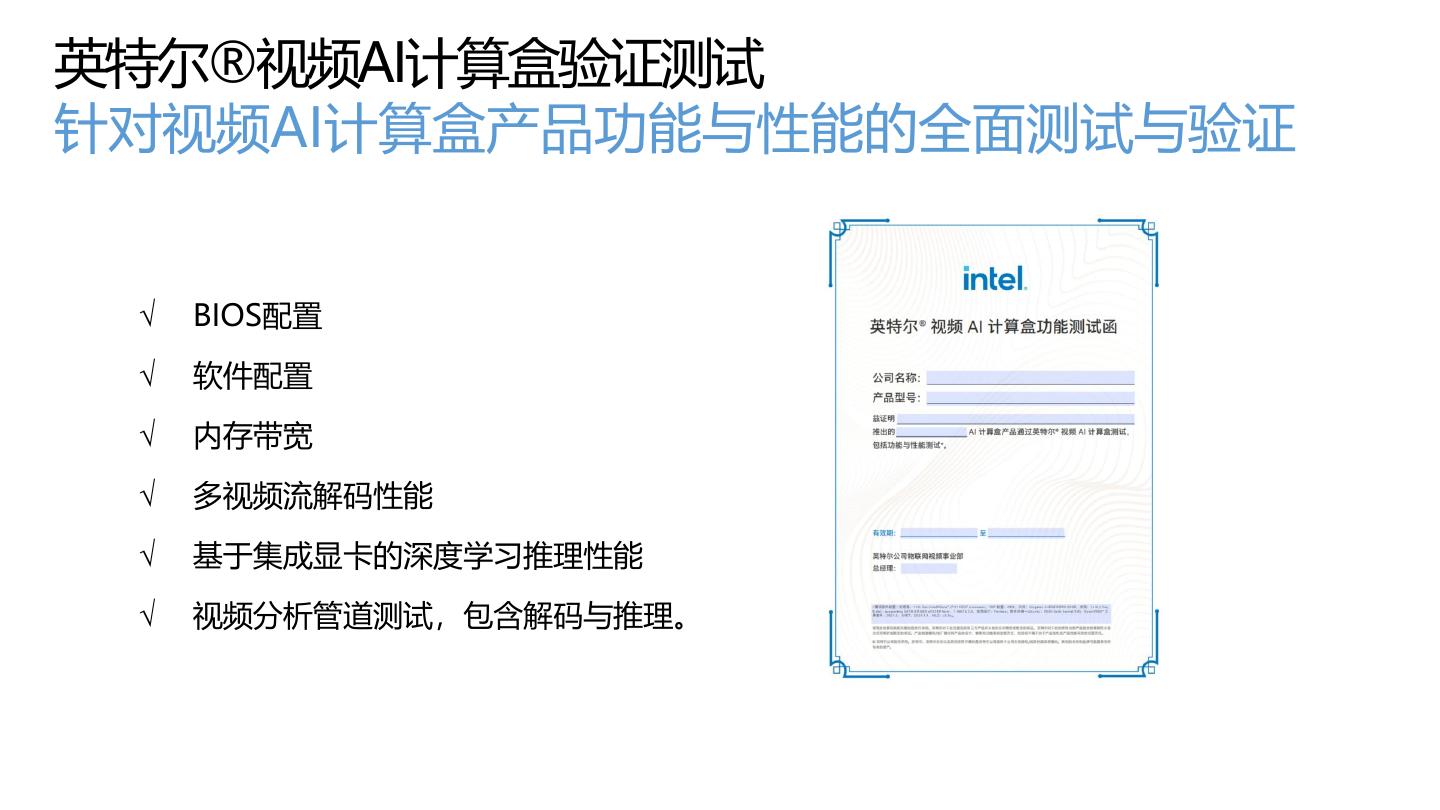 10 .英特尔®视频AI计算盒验证测试 针对视频AI计算盒产品功能与性能的全面测试与验证 BIOS配置 软件配置 内存带宽 多视频流解码性能 基于集成显卡的深度学习推理性能 视频分析管道测试,包含解码与推理。