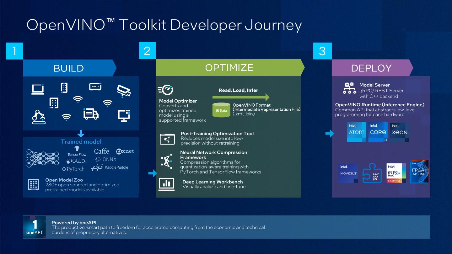 14 .OpenVINO™ Toolkit Developer Journey Model Server Read, Load, Infer gRPC/ REST Server with C++ backend Model Optimizer Converts and OpenVINO Format OpenVINO Runtime (Inference Engine) optimizes trained IR Data (Intermediate Representation File) Common API that abstracts low-level model using a (.xml, .bin) programming for each hardware supported framework Post-Training Optimization Tool Reduces model size into low- precision without retraining Neural Network Compression Framework Compression algorithms for quantization-aware training with PyTorch and TensorFlow frameworks Intel® GNA Open Model Zoo Deep Learning Workbench (IP) 280+ open sourced and optimized Visually analyze and fine-tune pretrained models available Powered by oneAPI The productive, smart path to freedom for accelerated computing from the economic and technical burdens of proprietary alternatives.