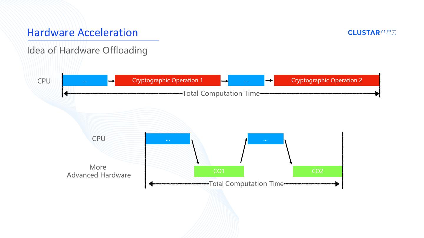 10 .Hardware Acceleration Idea of Hardware Offloading CPU … Cryptographic Operation 1 … Cryptographic Operation 2 Total Computation Time CPU … … More CO1 CO2 Advanced Hardware Total Computation Time