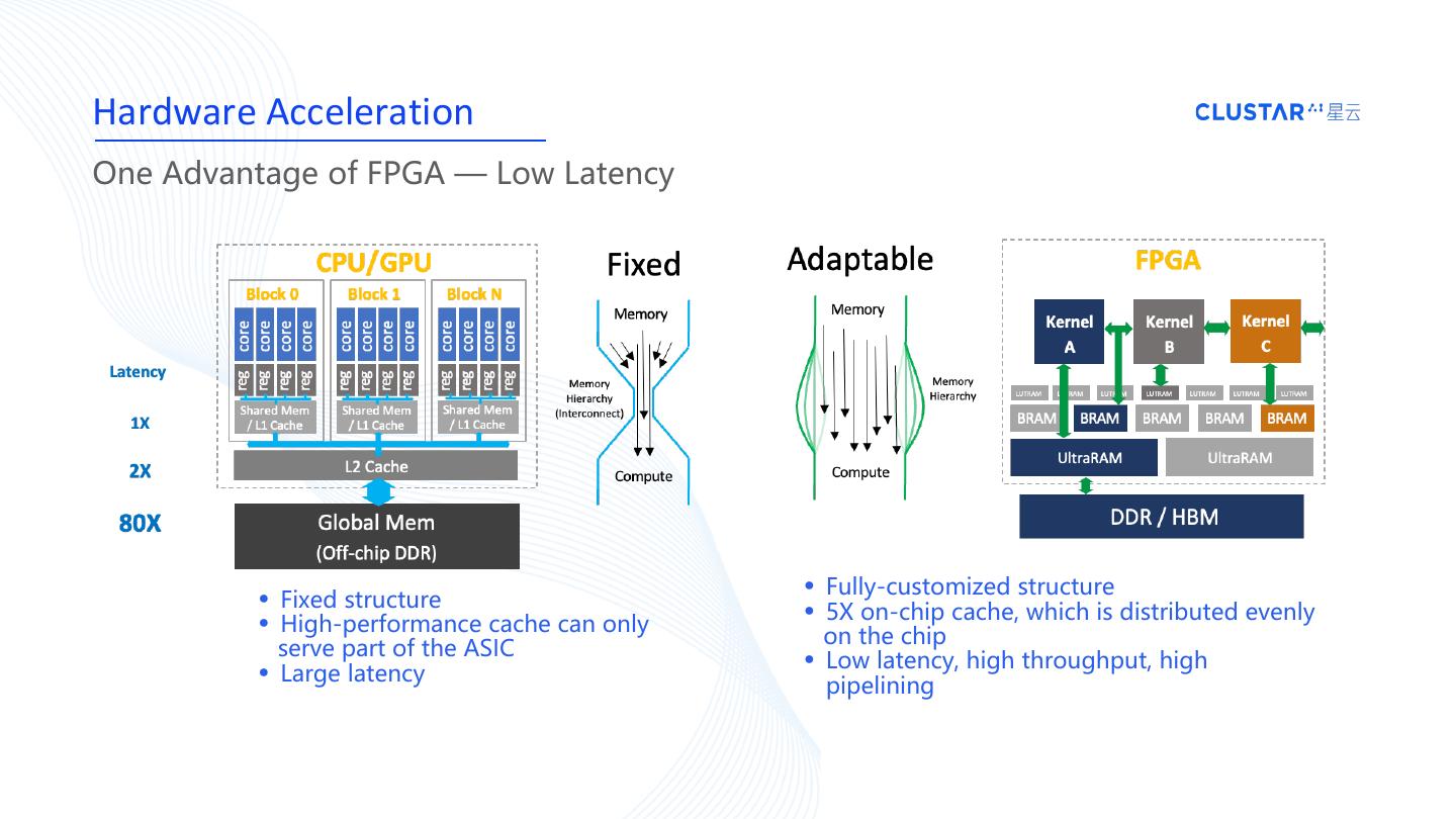 12 .Hardware Acceleration One Advantage of FPGA — Low Latency • Fixed structure • Fully-customized structure • High-performance cache can only • 5X on-chip cache, which is distributed evenly on the chip serve part of the ASIC • Large latency • Low latency, high throughput, high pipelining