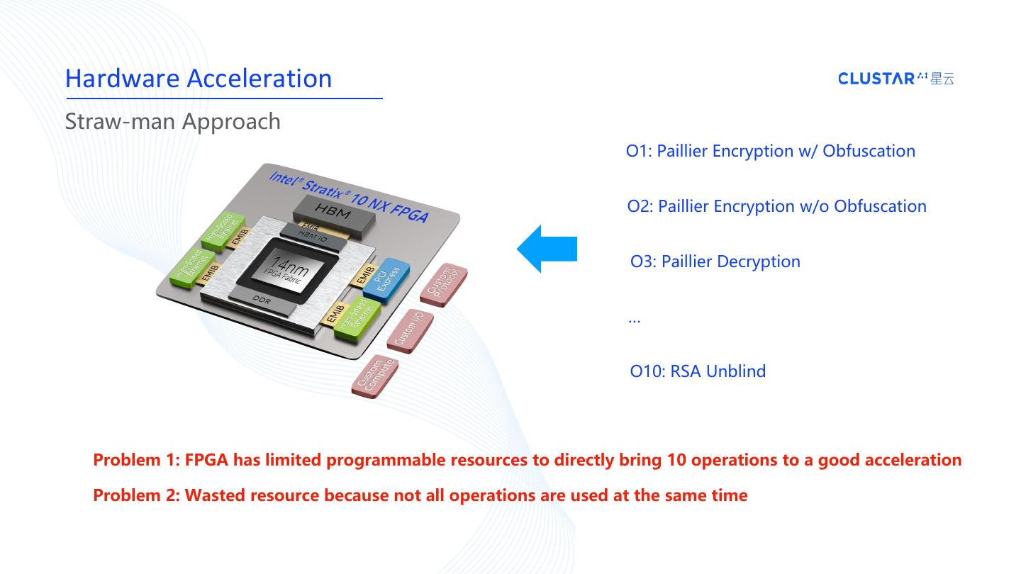 13 .Hardware Acceleration Straw-man Approach O1: Paillier Encryption w/ Obfuscation O2: Paillier Encryption w/o Obfuscation O3: Paillier Decryption … O10: RSA Unblind Problem 1: FPGA has limited programmable resources to directly bring 10 operations to a good acceleration Problem 2: Wasted resource because not all operations are used at the same time
