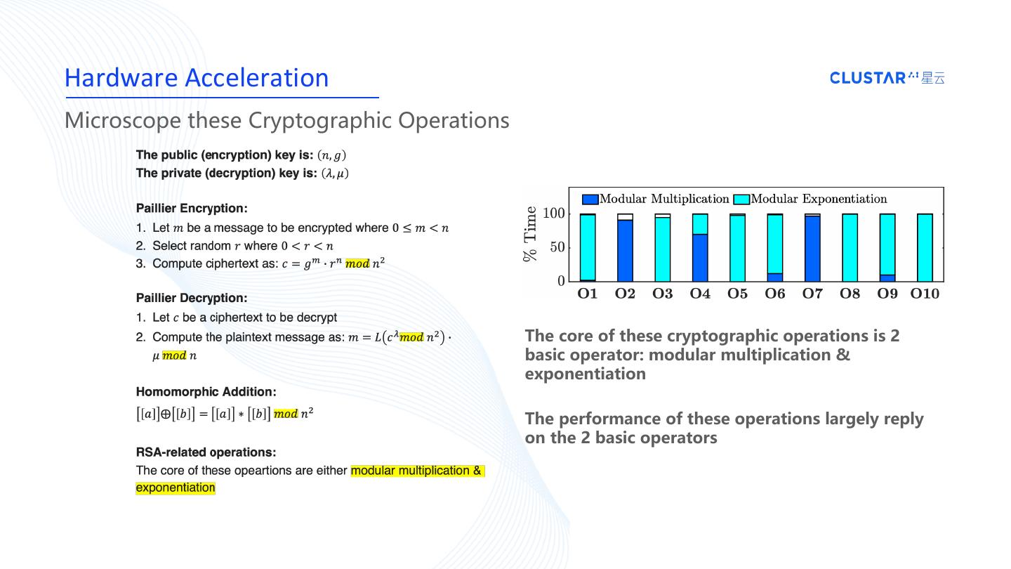 14 .Hardware Acceleration Microscope these Cryptographic Operations The core of these cryptographic operations is 2 basic operator: modular multiplication & exponentiation The performance of these operations largely reply on the 2 basic operators