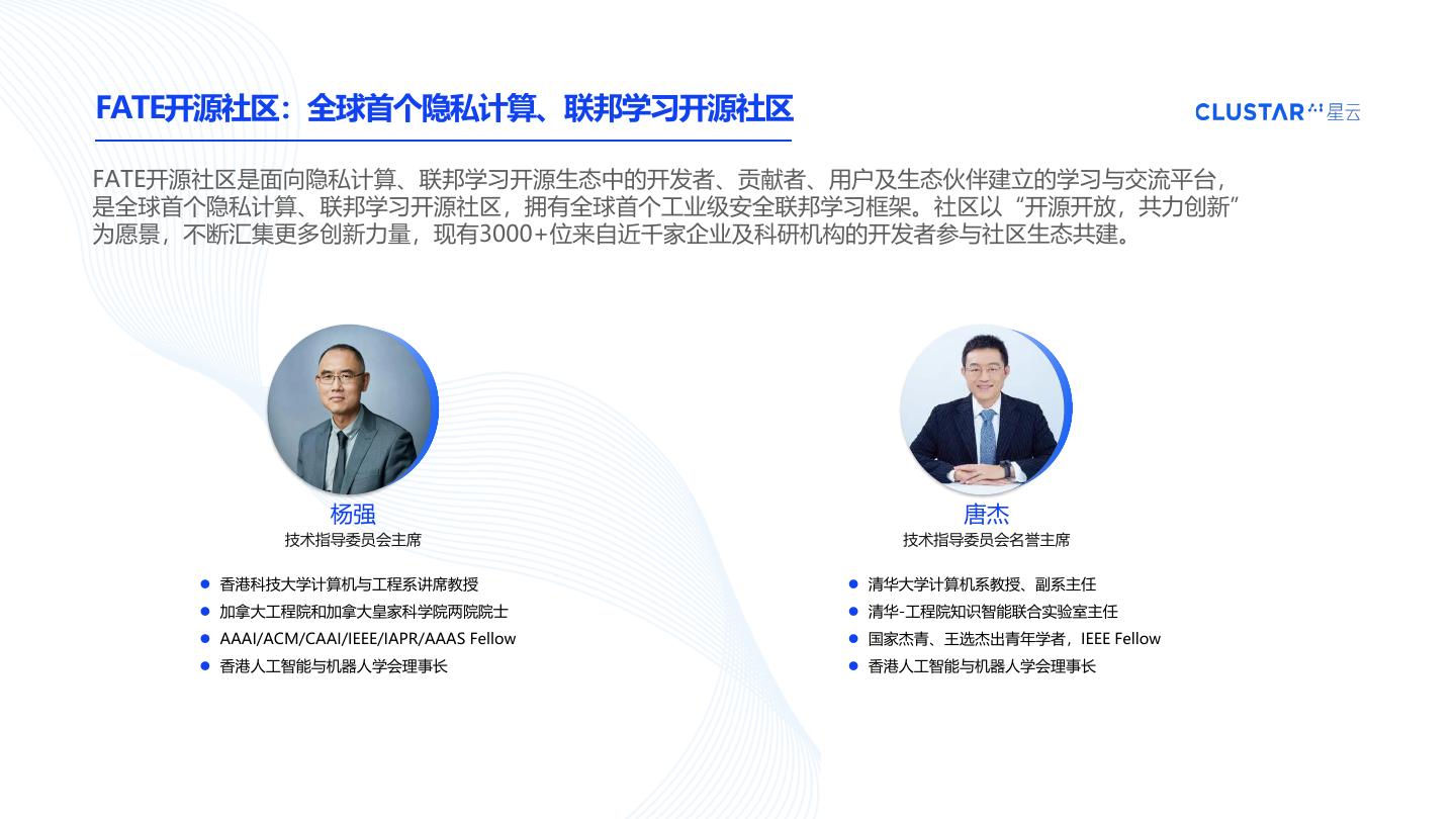 21 .FATE开源社区:全球首个隐私计算、联邦学习开源社区 FATE开源社区是面向隐私计算、联邦学习开源生态中的开发者、贡献者、用户及生态伙伴建立的学习与交流平台, 是全球首个隐私计算、联邦学习开源社区,拥有全球首个工业级安全联邦学习框架。社区以“开源开放,共力创新” 为愿景,不断汇集更多创新力量,现有3000+位来自近千家企业及科研机构的开发者参与社区生态共建。 杨强 唐杰 技术指导委员会主席 技术指导委员会名誉主席 ⚫ 香港科技大学计算机与工程系讲席教授 ⚫ 清华大学计算机系教授、副系主任 ⚫ 加拿大工程院和加拿大皇家科学院两院院士 ⚫ 清华-工程院知识智能联合实验室主任 ⚫ AAAI/ACM/CAAI/IEEE/IAPR/AAAS Fellow ⚫ 国家杰青、王选杰出青年学者,IEEE Fellow ⚫ 香港人工智能与机器人学会理事长 ⚫ 香港人工智能与机器人学会理事长