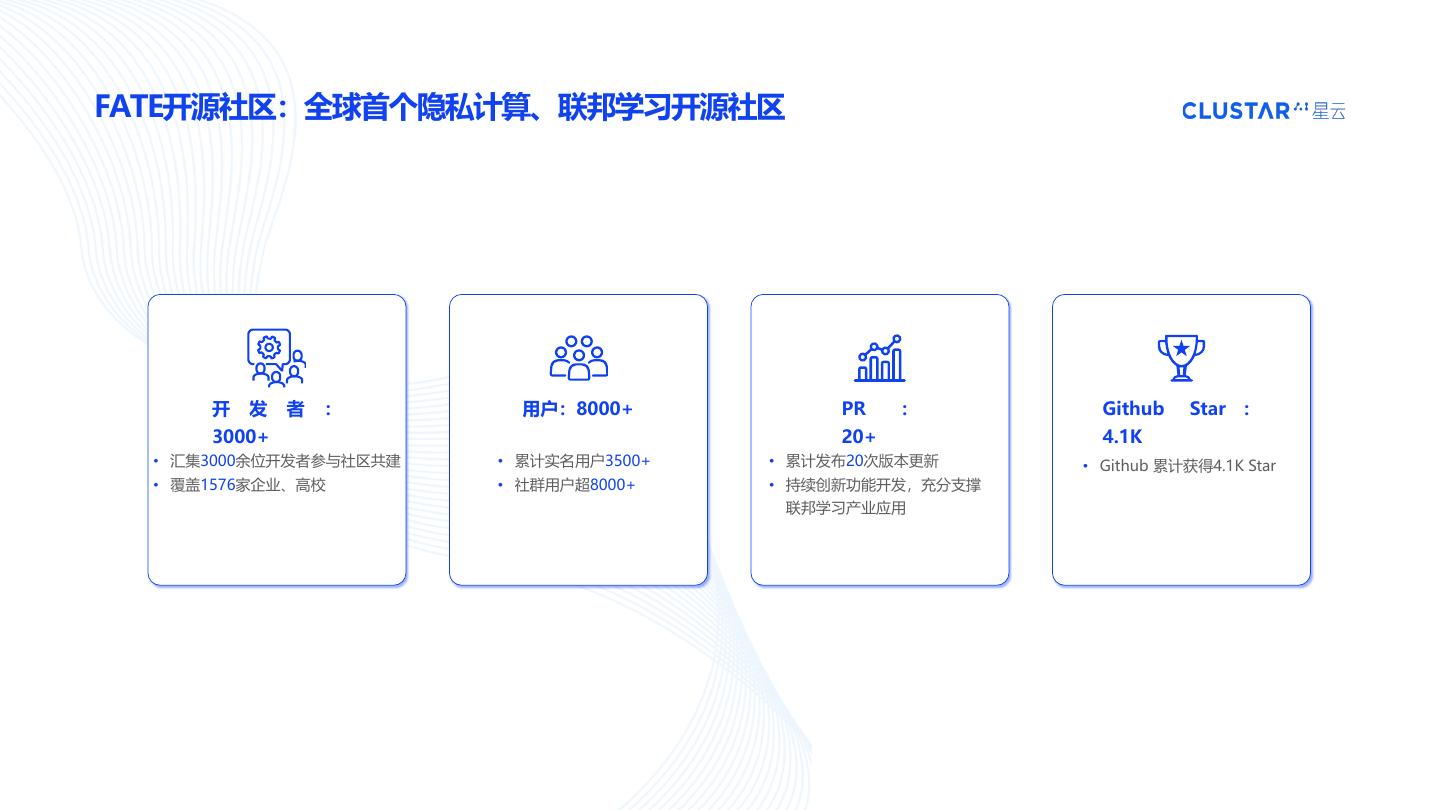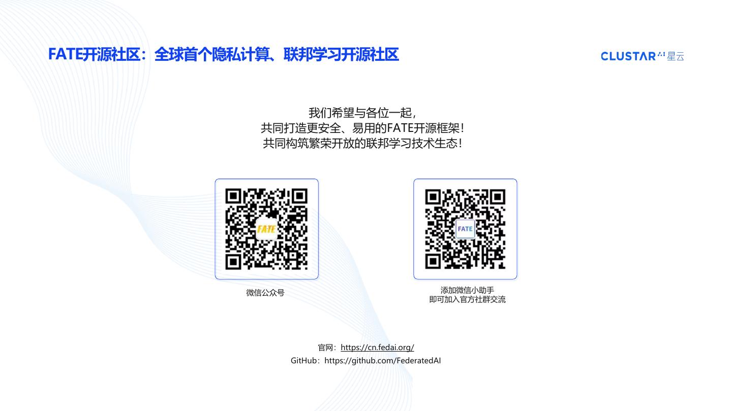 23 .FATE开源社区:全球首个隐私计算、联邦学习开源社区 我们希望与各位一起, 共同打造更安全、易用的FATE开源框架! 共同构筑繁荣开放的联邦学习技术生态! 微信公众号 添加微信小助手 即可加入官方社群交流 官网:https://cn.fedai.org/ GitHub:https://github.com/FederatedAI