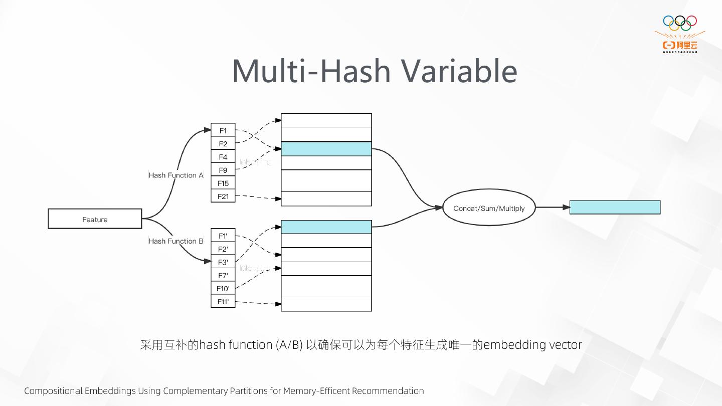 11 . Multi-Hash Variable 采用互补的hash function (A/B) 以确保可以为每个特征生成唯一的embedding vector Compositional Embeddings Using Complementary Partitions for Memory-Efficent Recommendation