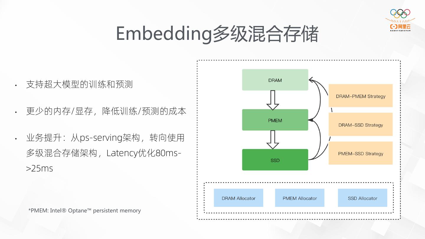 20 . Embedding多级混合存储 • 支持超大模型的训练和预测 • 更少的内存/显存,降低训练/预测的成本 • 业务提升:从ps-serving架构,转向使用 多级混合存储架构,Latency优化80ms- >25ms *PMEM: Intel® Optane™ persistent memory