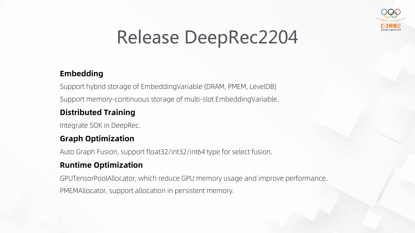 25 . Release DeepRec2204 Embedding Support hybrid storage of EmbeddingVariable (DRAM, PMEM, LevelDB) Support memory-continuous storage of multi-slot EmbeddingVariable. Distributed Training Integrate SOK in DeepRec. Graph Optimization Auto Graph Fusion, support float32/int32/int64 type for select fusion. Runtime Optimization GPUTensorPoolAllocator, which reduce GPU memory usage and improve performance. PMEMAllocator, support allocation in persistent memory.