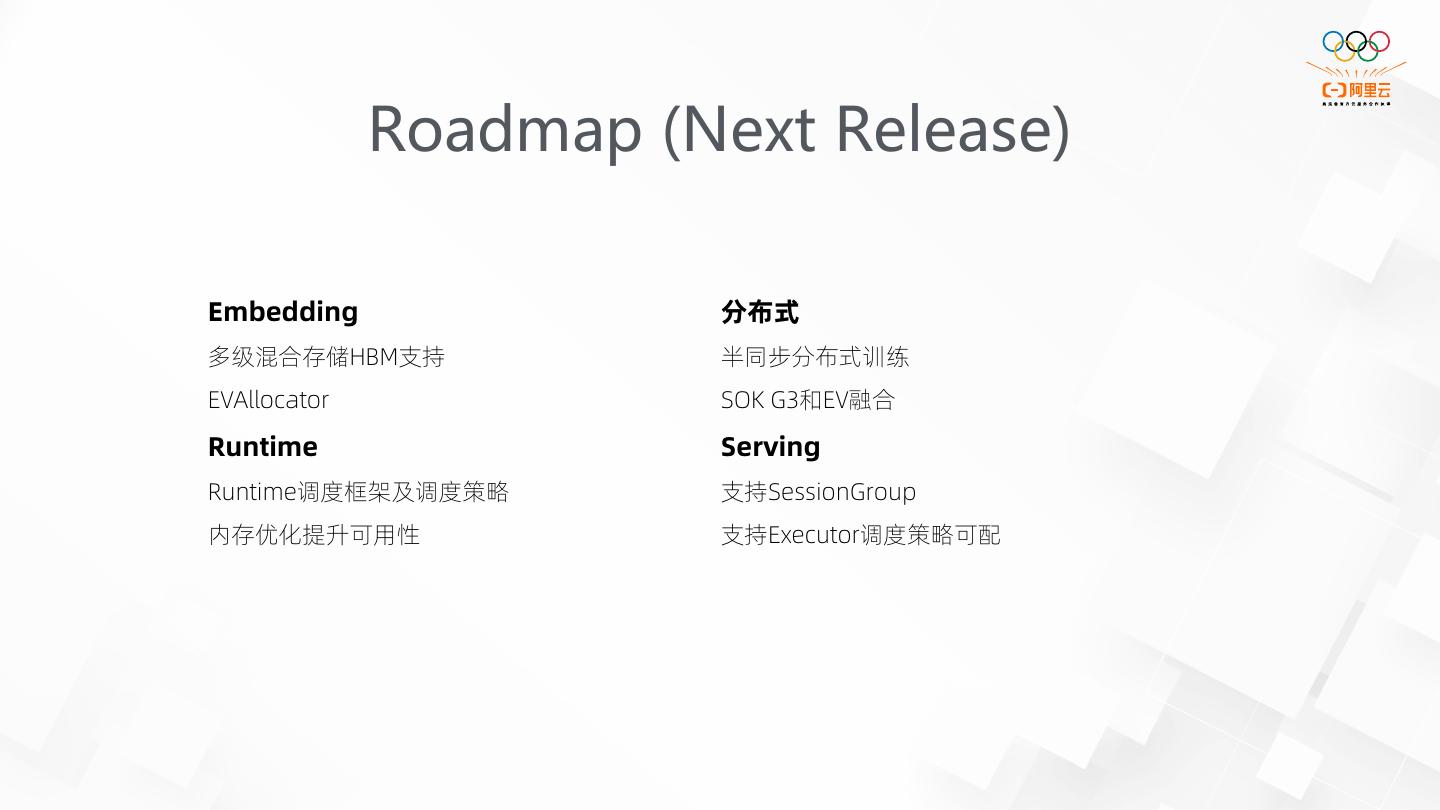 27 . Roadmap (Next Release) Embedding 分布式 多级混合存储HBM支持 半同步分布式训练 EVAllocator SOK G3和EV融合 Runtime Serving Runtime调度框架及调度策略 支持SessionGroup 内存优化提升可用性 支持Executor调度策略可配
