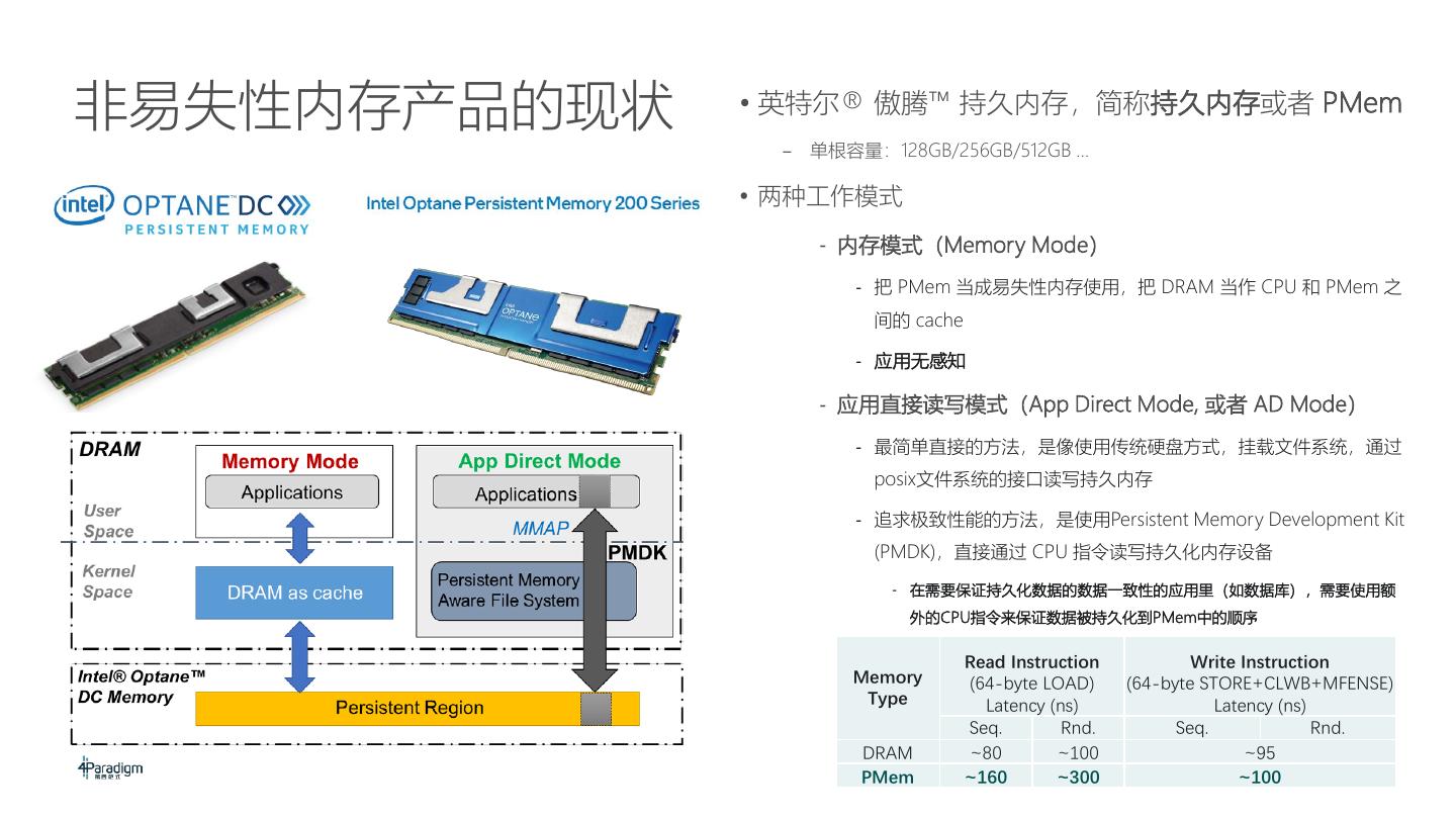 3 .异构内存 = DRAM + 非易失性内存 CPU 缓存 1-10 ns CPU 缓存 1-10 ns ~100 ns DRAM 内存 ~100 ns 异构内存 (DRAM) 非易失性内存 < 1 us (英特尔® 傲腾™ 持久内存) 外存(SSD、硬盘……) 10 us - 10 ms 10 us - 10 ms 外存(SSD、硬盘……) 容量 容量 非易失性内存 技术使得现代内存架构演变成了异构内存架构 - 更丰富的存储层级 – 多级存储 - 除外存以外提供了更为高性能的持久化介质 – 内存数据持久化