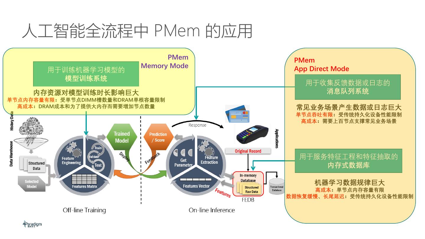 9 . 人工智能全流程中 PMem 的应用 PMem PMem Memory Mode App Direct Mode 用于训练机器学习模型的 模型训练系统 用于收集反馈数据或日志的 内存资源对模型训练时长影响巨大 消息队列系统 单节点内存容量有限:受单节点DIMM槽数量和DRAM单根容量限制 高成本:DRAM成本和为了提供大内存而需要增加节点数量 常见业务场景产生数据或日志巨大 单节点吞吐有限:受传统持久化设备性能限制 高成本:需要上百节点支撑常见业务场景 用于服务特征工程和特征抽取的 内存式数据库 机器学习数据规律巨大 高成本:单节点内存容量有限 数据恢复缓慢、长尾延迟:受传统持久化设备性能限制