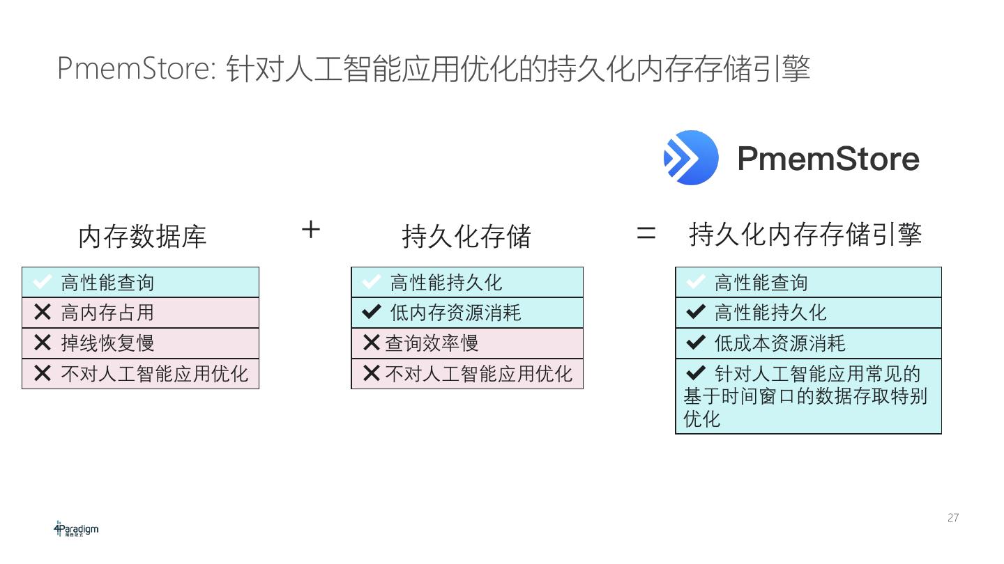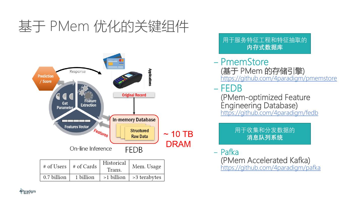 10 .基于 PMem 优化的关键组件 用于服务特征工程和特征抽取的 内存式数据库 – PmemStore (基于 PMem 的存储引擎) https://github.com/4paradigm/pmemstore – FEDB (PMem-optimized Feature Engineering Database) https://github.com/4paradigm/fedb 用于收集和分发数据的 消息队列系统 – Pafka (PMem Accelerated Kafka) https://github.com/4paradigm/pafka