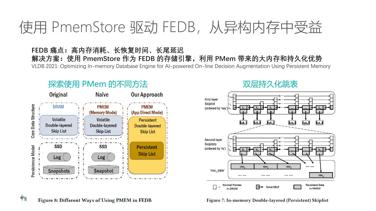 14 .使用 PmemStore 驱动 FEDB,从异构内存中受益 FEDB 痛点:高内存消耗、长恢复时间、长尾延迟 解决方案:使用 PmemStore 作为 FEDB 的存储引擎,利用 PMem 带来的大内存和持久化优势 VLDB 2021: Optimizing In-memory Database Engine for AI-powered On-line Decision Augmentation Using Persistent Memory 探索使用 PMem 的不同方法 双层持久化跳表