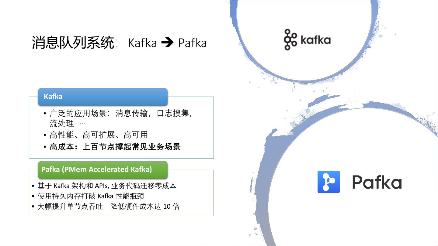 17 .消息队列系统:Kafka Pafka Kafka • 广泛的应用场景:消息传输,日志搜集, 流处理…… • 高性能、高可扩展、高可用 • 高成本:上百节点撑起常见业务场景 Pafka (PMem Accelerated Kafka) • 基于 Kafka 架构和 APIs, 业务代码迁移零成本 • 使用持久内存打破 Kafka 性能瓶颈 • 大幅提升单节点吞吐,降低硬件成本达 10 倍