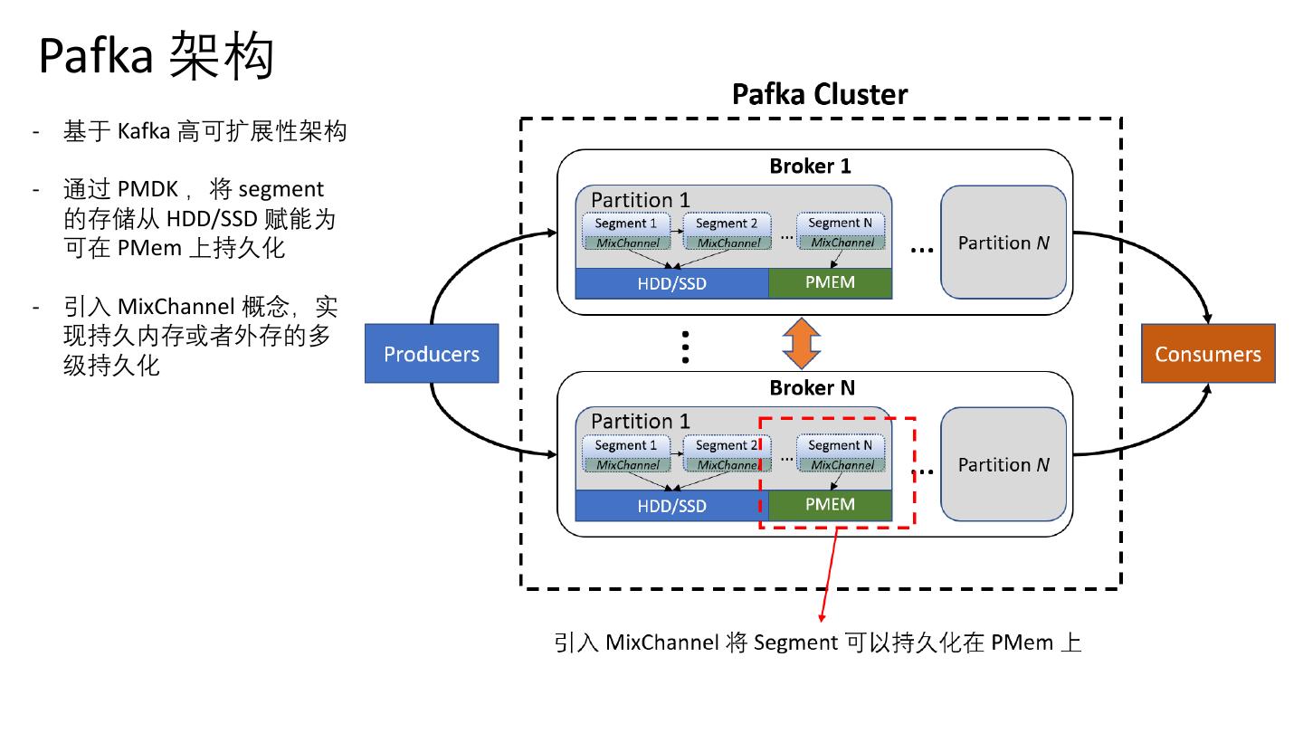 18 .Pafka 架构 - 基于 Kafka 高可扩展性架构 - 通过 PMDK ,将 segment 的存储从 HDD/SSD 赋能为 可在 PMem 上持久化 - 引入 MixChannel 概念,实 现持久内存或者外存的多 级持久化