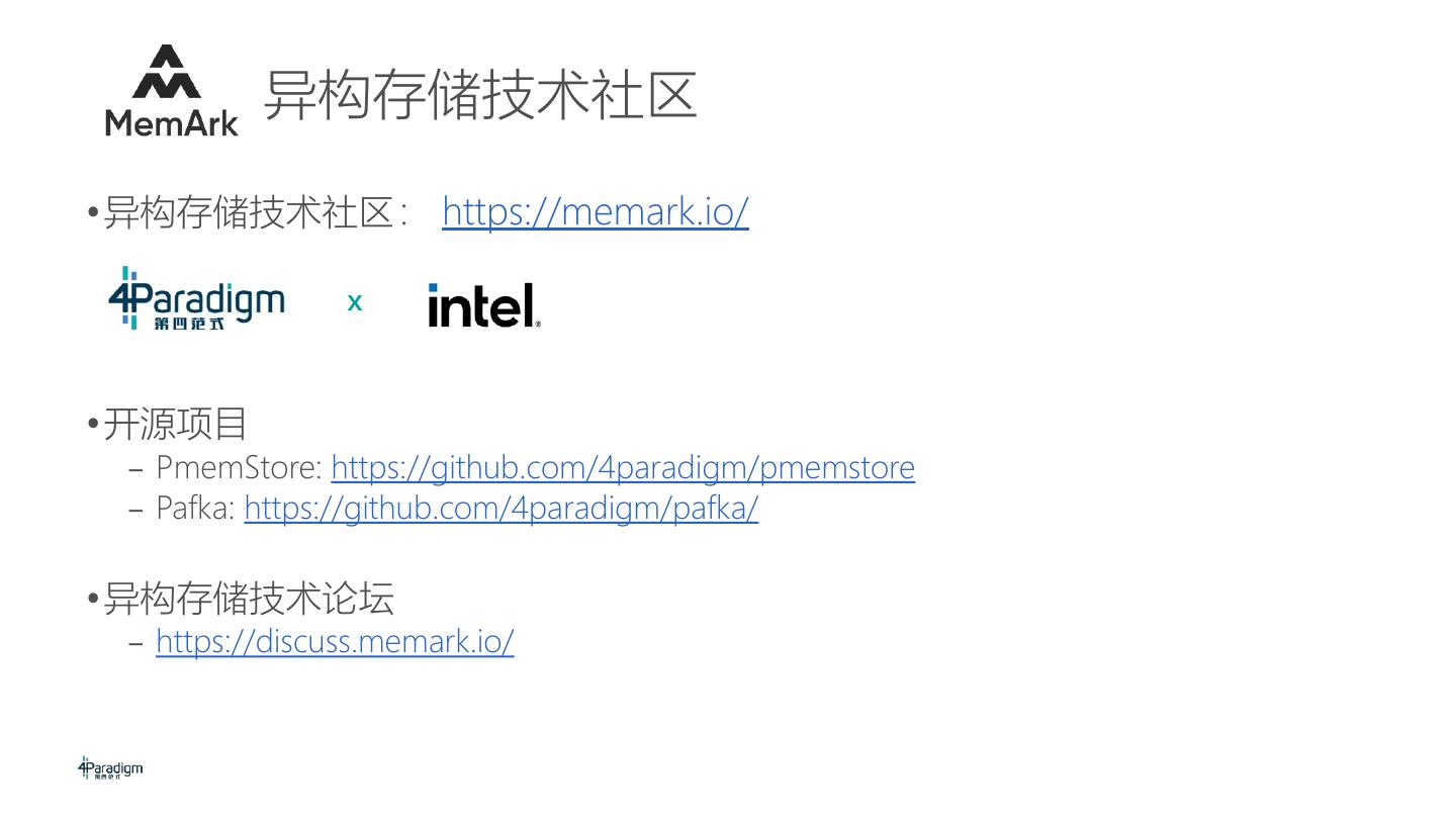 20 . 异构存储技术社区 • 异构存储技术社区: https://memark.io/ x • 开源项目 – PmemStore: https://github.com/4paradigm/pmemstore – Pafka: https://github.com/4paradigm/pafka/ • 异构存储技术论坛 – https://discuss.memark.io/