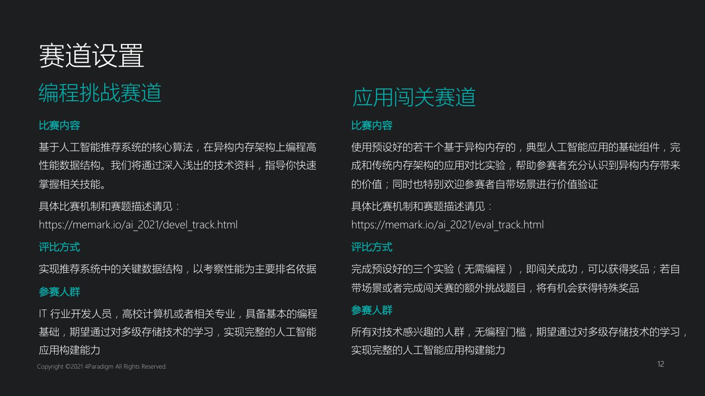 11 .赛程安排 报名 比赛 颁奖 即日起 – 7.7 7.8 – 8.31 9月 Copyright ©2021 4Paradigm All Rights Reserved. 11