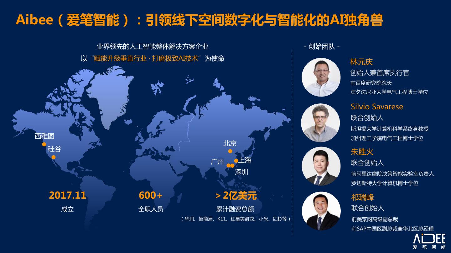 2 .Aibee(爱笔智能):引领线下空间数字化与智能化的AI独角兽 业界领先的人工智能整体解决方案企业 - 创始团队 - 以“赋能升级垂直行业 · 打磨极致AI技术”为使命 林元庆 创始人兼首席执行官 前百度研究院院长 宾夕法尼亚大学电气工程博士学位 Silvio Savarese 联合创始人 斯坦福大学计算机科学系终身教授 西雅图 加州理工学院电气工程博士学位 北京 硅谷 朱胜火 广州 上海 联合创始人 深圳 前阿里达摩院决策智能实验室负责人 罗切斯特大学计算机博士学位 2017.11 600+ >2亿美元 祁瑞峰 成立 全职人员 累计融资总额 联合创始人 (华润、招商局、K11、红星美凯龙、小米、红杉等) 前美菜网高级副总裁 前SAP中国区副总裁兼华北区总经理