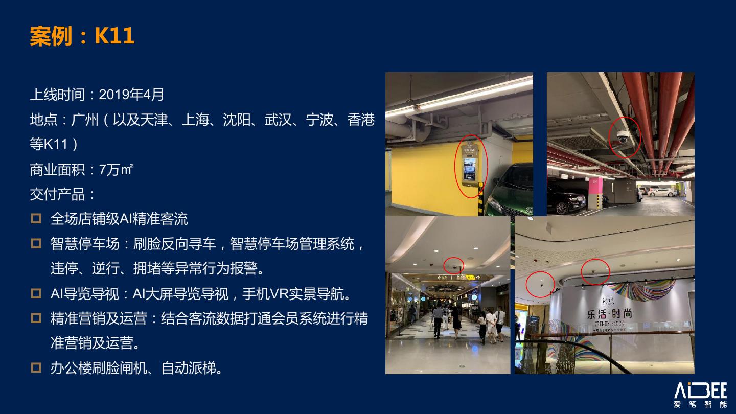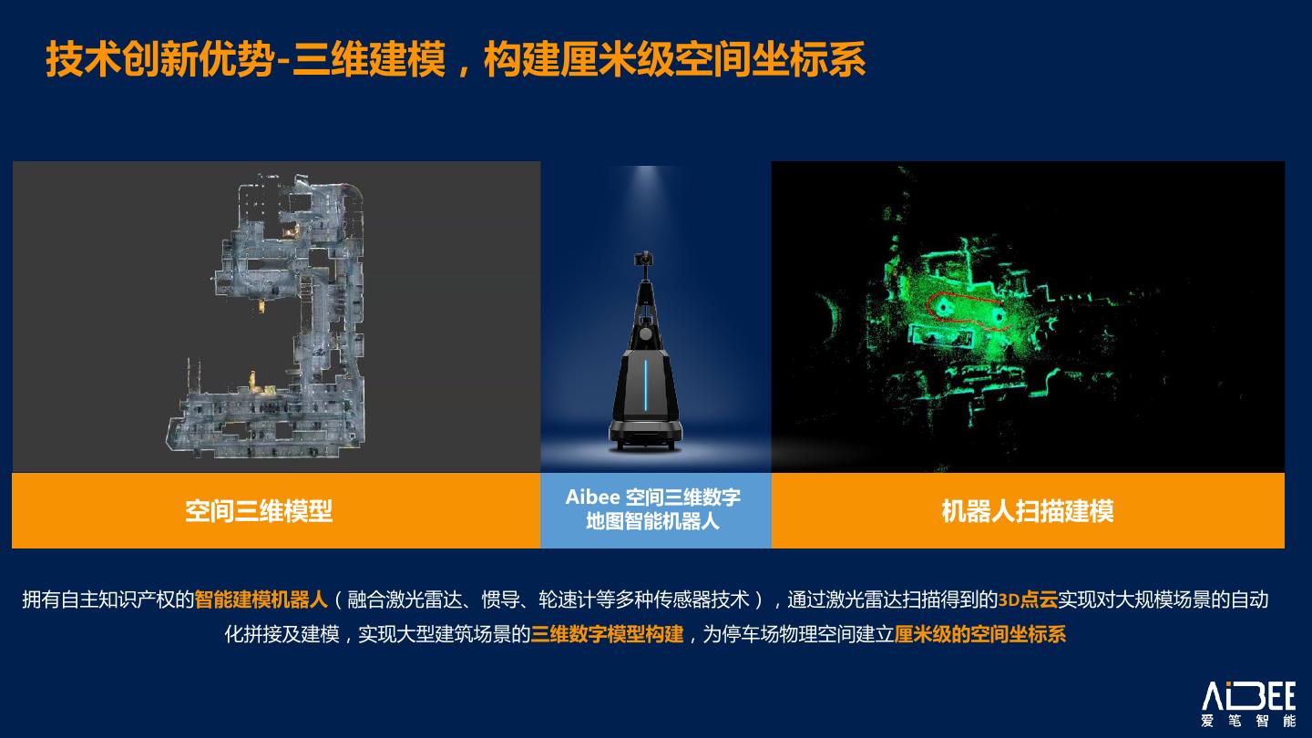 10 . 技术创新优势-三维建模,构建厘米级空间坐标系 Aibee 空间三维数字 空间三维模型 地图智能机器人 机器人扫描建模 拥有自主知识产权的智能建模机器人(融合激光雷达、惯导、轮速计等多种传感器技术),通过激光雷达扫描得到的3D点云实现对大规模场景的自动 化拼接及建模,实现大型建筑场景的三维数字模型构建,为停车场物理空间建立厘米级的空间坐标系