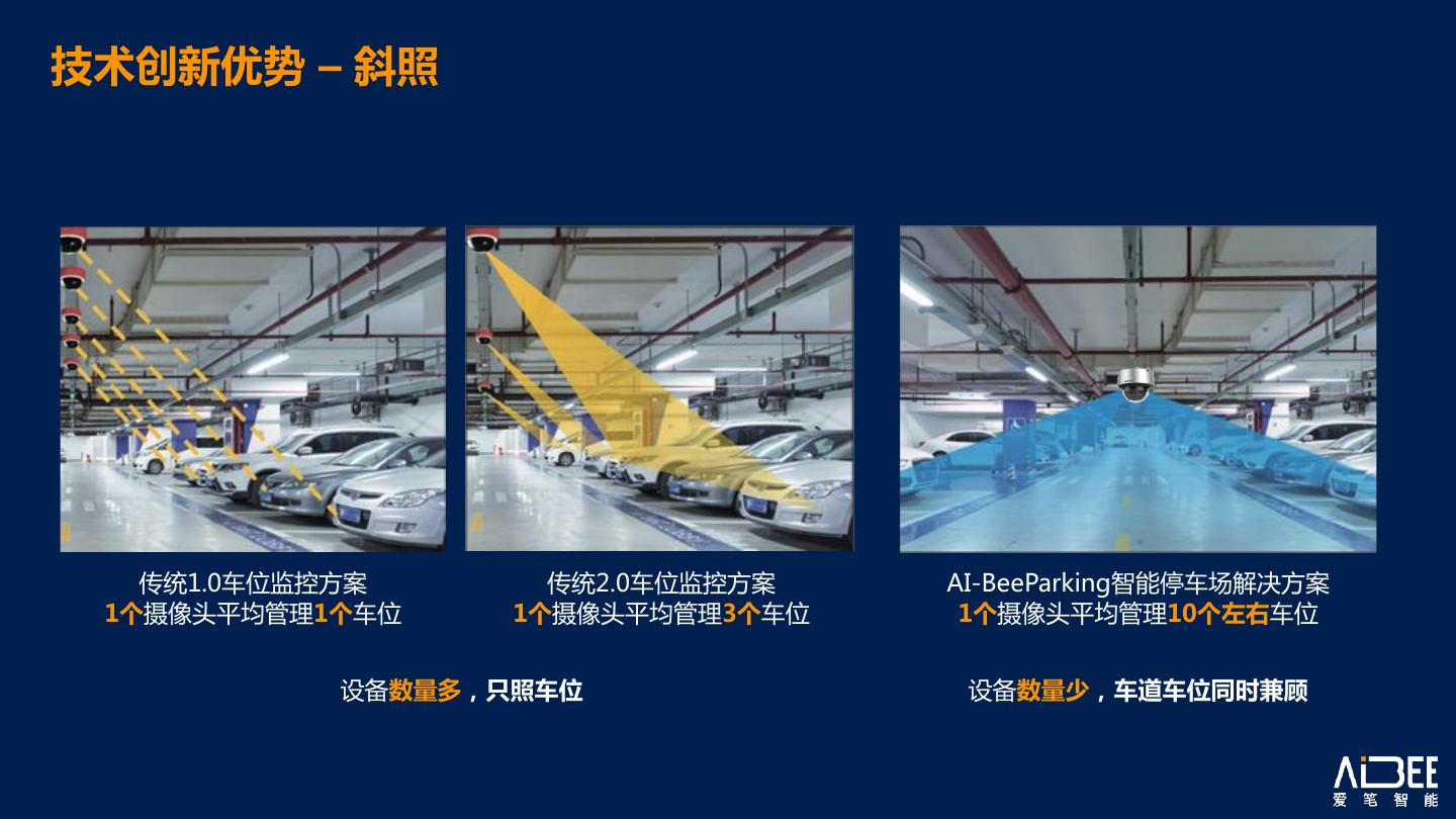 11 .技术创新优势 – 斜照 传统1.0车位监控方案 传统2.0车位监控方案 AI-BeeParking智能停车场解决方案 1个摄像头平均管理1个车位 1个摄像头平均管理3个车位 1个摄像头平均管理10个左右车位 设备数量多,只照车位 设备数量少,车道车位同时兼顾