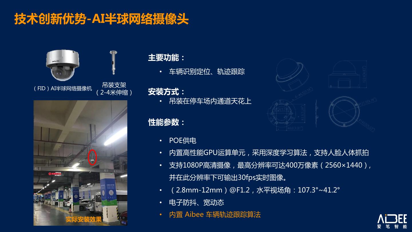 12 .技术创新优势-AI半球网络摄像头 主要功能: • 车辆识别定位、轨迹跟踪 (FID)AI半球网络摄像机 吊装支架 (2-4米伸缩) 安装方式: • 吊装在停车场内通道天花上 性能参数: • POE供电 • 内置高性能GPU运算单元,采用深度学习算法,支持人脸人体抓拍 • 支持1080P高清摄像,最高分辨率可达400万像素(2560×1440), 并在此分辨率下可输出30fps实时图像。 • (2.8mm-12mm)@F1.2,水平视场角:107.3°~41.2° • 电子防抖、宽动态 • 内置 Aibee 车辆轨迹跟踪算法 实际安装效果