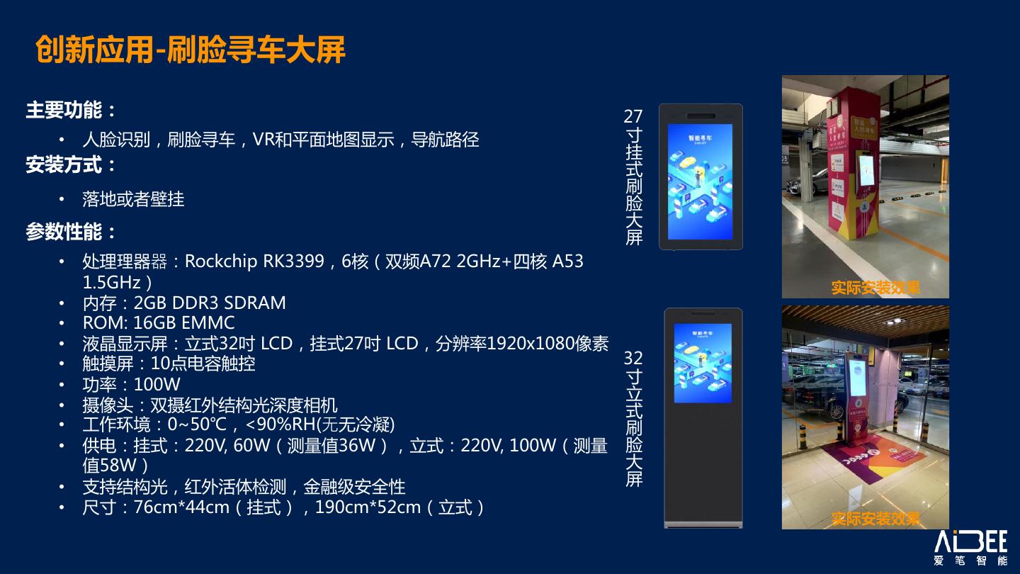 16 .创新应用-刷脸寻车大屏 主要功能: 27 • 人脸识别,刷脸寻车,VR和平面地图显示,导航路径 寸 挂 安装方式: 式 刷 • 落地或者壁挂 脸 大 参数性能: 屏 • 处理理器器:Rockchip RK3399,6核(双频A72 2GHz+四核 A53 1.5GHz) 实际安装效果 • 内存:2GB DDR3 SDRAM • ROM: 16GB EMMC • 液晶显示屏:立式32吋 LCD,挂式27吋 LCD,分辨率1920x1080像素 • 触摸屏:10点电容触控 32 • 功率:100W 寸 立 • 摄像头:双摄红外结构光深度相机 式 • 工作环境:0~50℃,<90%RH(⽆无冷凝) 刷 • 供电:挂式:220V, 60W(测量值36W),立式:220V, 100W(测量 脸 值58W) 大 • 支持结构光,红外活体检测,金融级安全性 屏 • 尺寸:76cm*44cm(挂式),190cm*52cm(立式) 实际安装效果