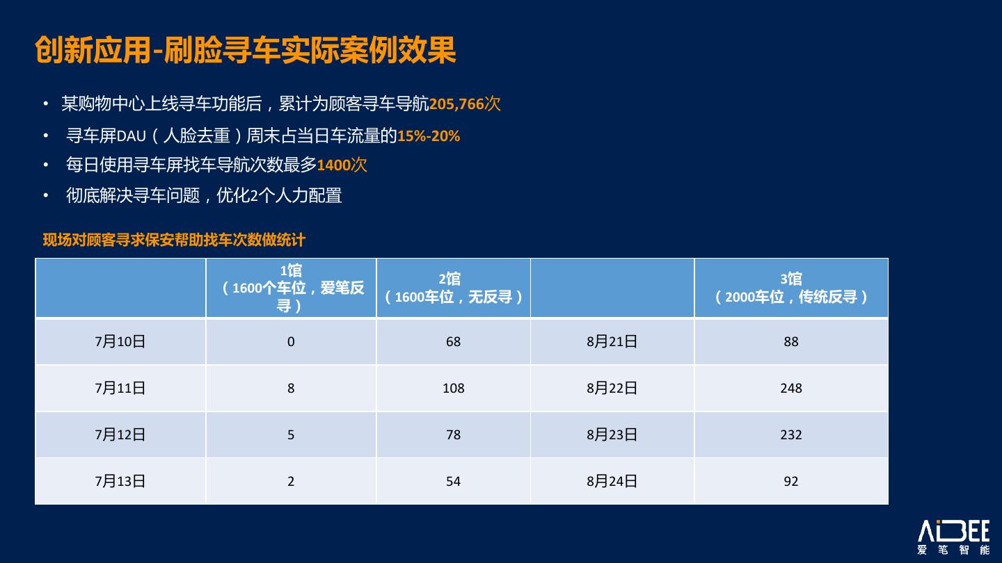 17 .创新应用-刷脸寻车实际案例效果 • 某购物中心上线寻车功能后,累计为顾客寻车导航205,766次 • 寻车屏DAU(人脸去重)周末占当日车流量的15%-20% • 每日使用寻车屏找车导航次数最多1400次 • 彻底解决寻车问题,优化2个人力配置 现场对顾客寻求保安帮助找车次数做统计 1馆 2馆 3馆 (1600个车位,爱笔反 (1600车位,无反寻) (2000车位,传统反寻) 寻) 7月10日 0 68 8月21日 88 7月11日 8 108 8月22日 248 7月12日 5 78 8月23日 232 7月13日 2 54 8月24日 92