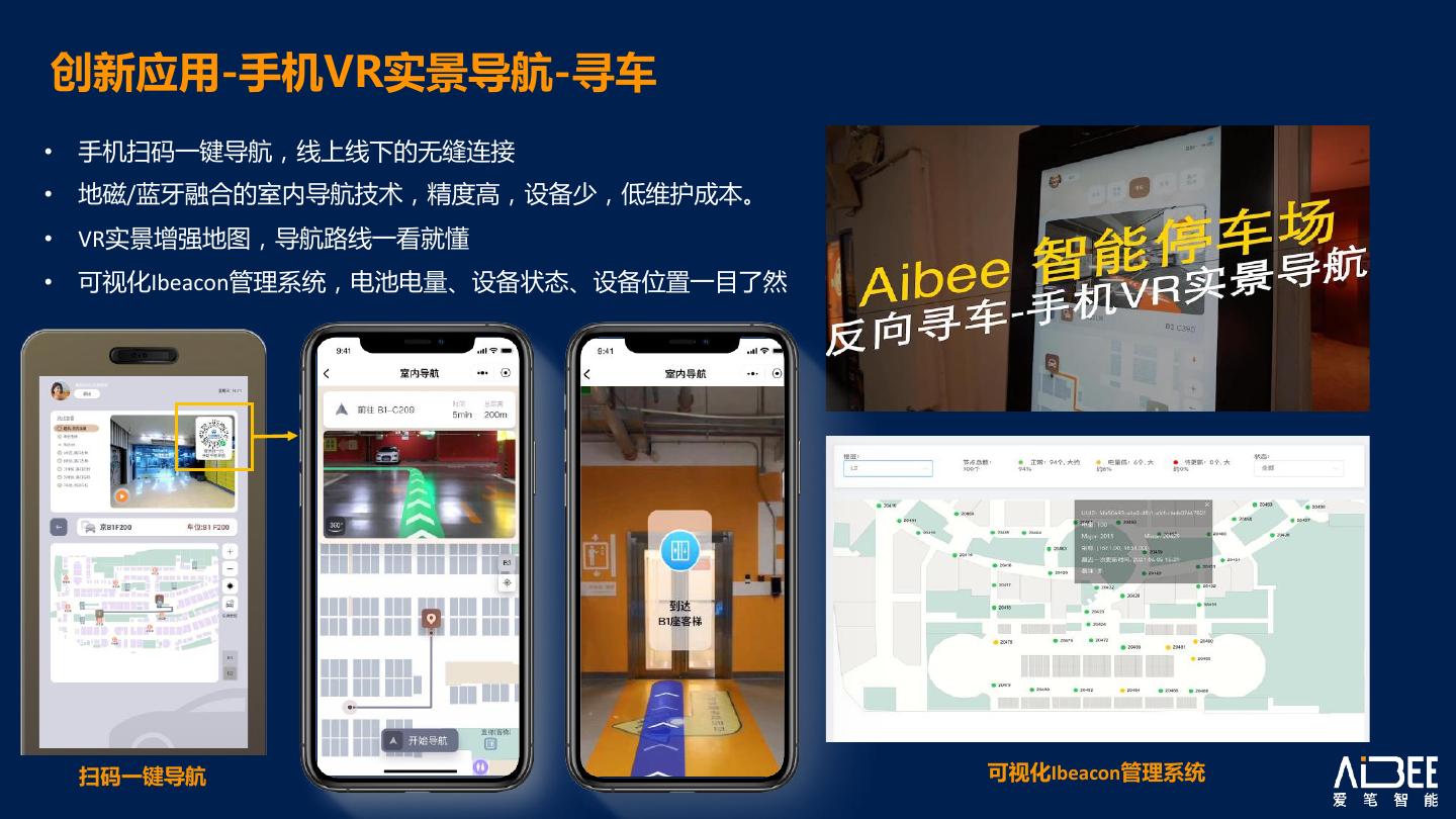 18 .创新应用-手机VR实景导航-寻车 • 手机扫码一键导航,线上线下的无缝连接 • 地磁/蓝牙融合的室内导航技术,精度高,设备少,低维护成本。 • VR实景增强地图,导航路线一看就懂 • 可视化Ibeacon管理系统,电池电量、设备状态、设备位置一目了然 扫码一键导航 可视化Ibeacon管理系统