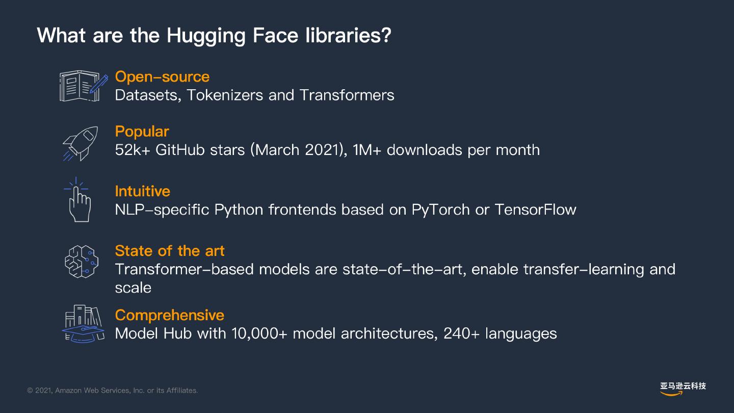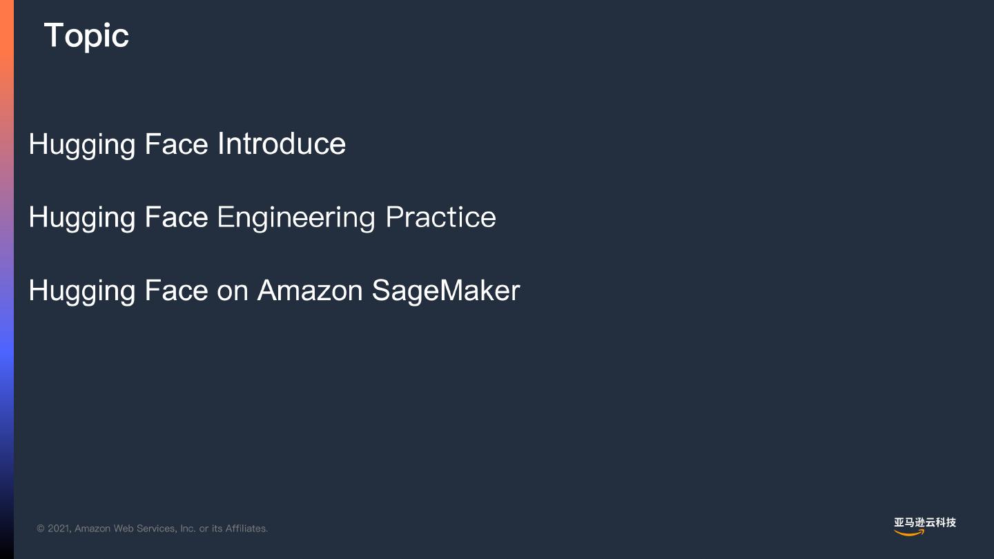 本次活动,肖老师将为大家分享《Hugging Face 框架介绍与工程化实践》,本次分享将从工程化实践的角度出发,介绍如何使用 Hugging Face 框架进行 NLP 模型的训练和部署,其中涉及到基于 Pytorch 的分布式训练与模型服务器的搭建,以及如何通过 Amazon SageMaker 快速上手使用 Hugging Face.