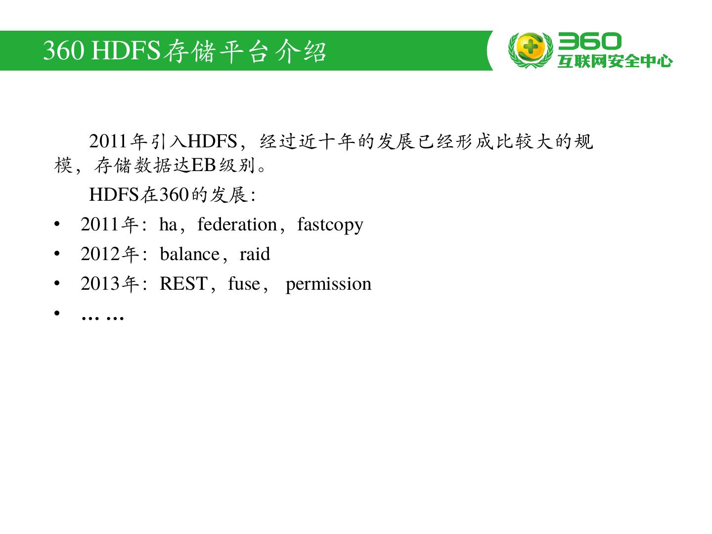 4 .360 HDFS存储平台介绍 2011年引入HDFS,经过近十年的发展已经形成比较大的规 模,存储数据达EB级别。 HDFS在360的发展: • 2011年:ha,federation,fastcopy • 2012年:balance,raid • 2013年:REST,fuse, permission • ……