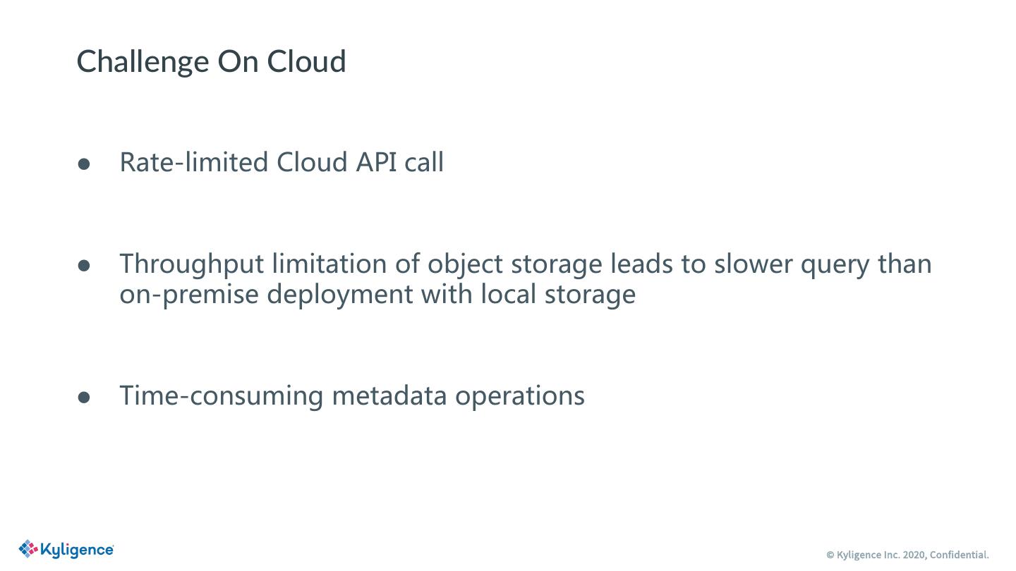 7 .Challenge On Cloud l Rate-limited Cloud API call l Throughput limitation of object storage leads to slower query than on-premise deployment with local storage l Time-consuming metadata operations © Kyligence Inc. 2020, Confidential.