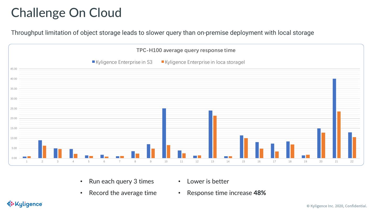 8 .Challenge On Cloud Throughput limitation of object storage leads to slower query than on-premise deployment with local storage TPC-H100 average query response time Kyligence Enterprise in S3 Kyligence Enterprise in loca storagel 45.00 40.00 35.00 30.00 25.00 20.00 15.00 10.00 5.00 0.00 1 2 3 4 5 6 7 8 9 10 11 12 13 14 15 16 17 18 19 20 21 22 • Run each query 3 times • Lower is better • Record the average time • Response time increase 48% © Kyligence Inc. 2020, Confidential.