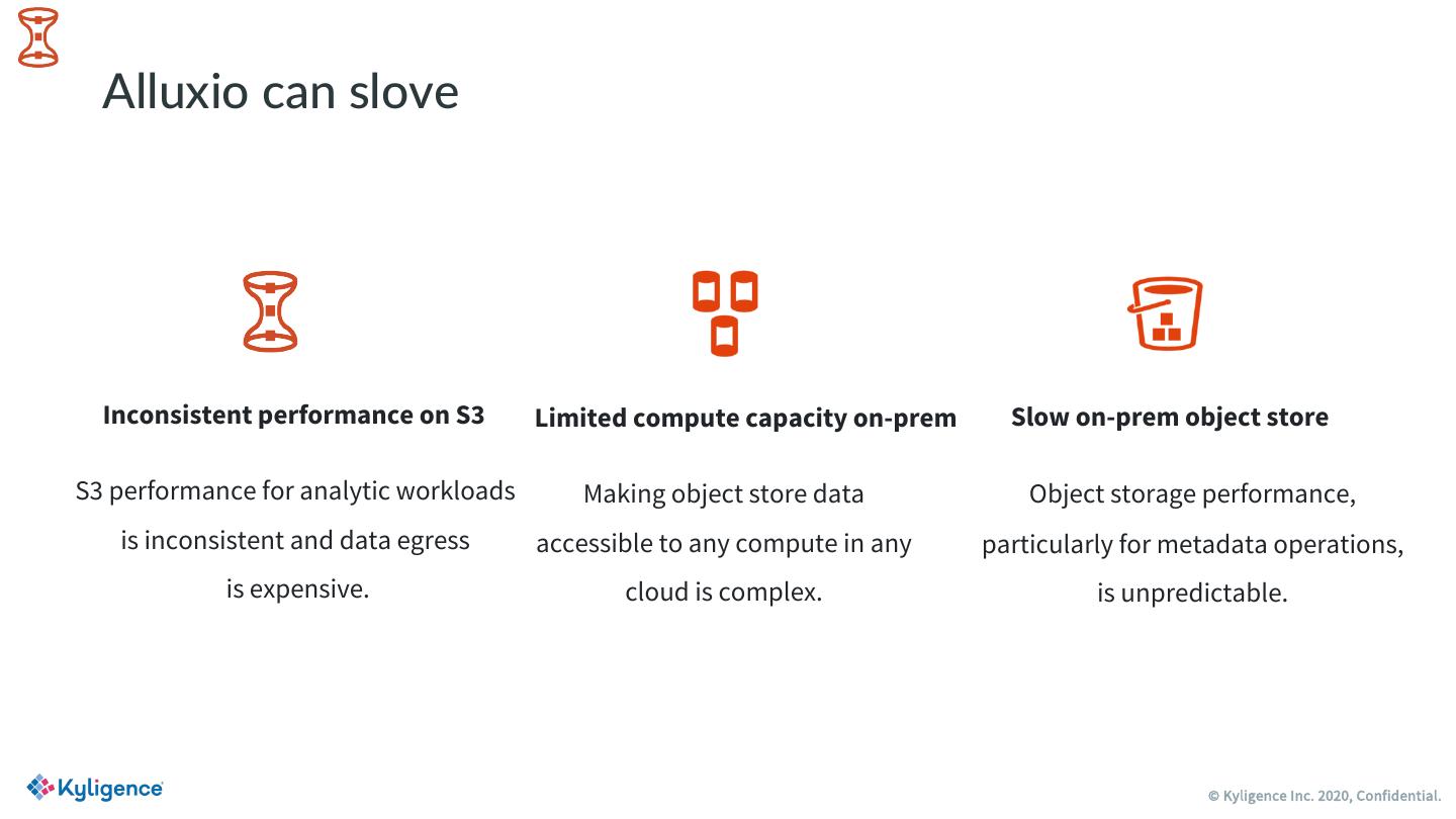 12 . Alluxio can slove Inconsistent performance on S3 Limited compute capacity on-prem Slow on-prem object store S3 performance for analytic workloads Making object store data Object storage performance, is inconsistent and data egress accessible to any compute in any particularly for metadata operations, is expensive. cloud is complex. is unpredictable. © Kyligence Inc. 2020, Confidential.