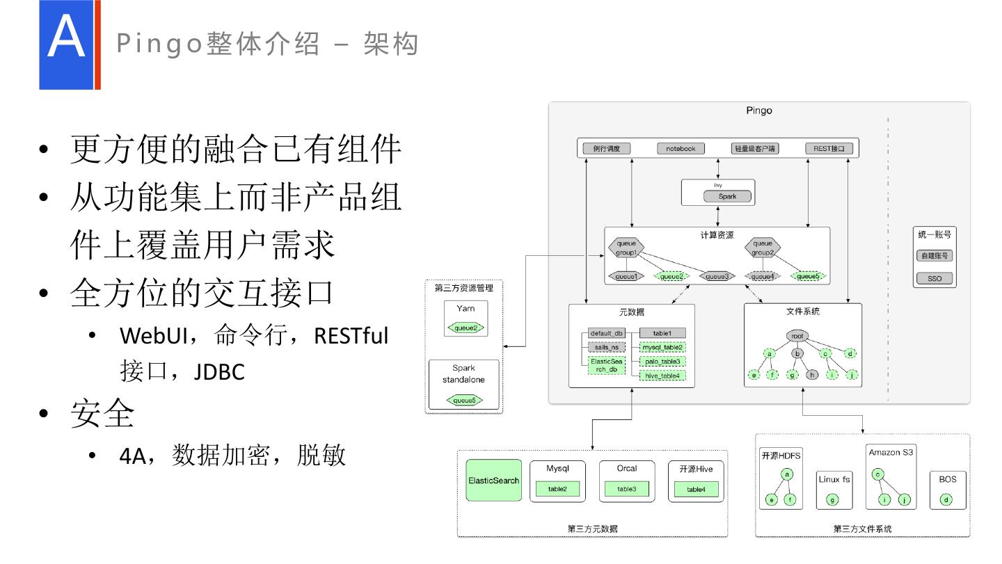 来自百度数据工厂Pingo核心团队的技术负责人张志宏作的题为“Alluxio在百度数据工厂Pingo中的应用”的报告。此次报告,他首先介绍了百度数据工厂Pingo的定位和解决的问题。接着分享了,基于Alluxio在Pingo中实现了一个文件管理服务层,并且扩展了Alluxio的UFS,新增了基于继承的ACL权限机制,提供了基于文件的UDF管理功能。最后,李老师还简单介绍Pingo其他功能点。