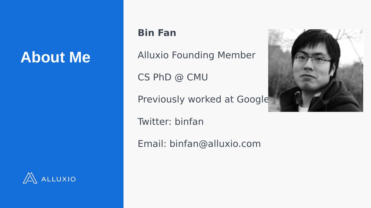2 .About Me Bin Fan Alluxio Founding Member CS PhD @ CMU Previously worked at Google Twitter: binfan Email : binfan@alluxio.com