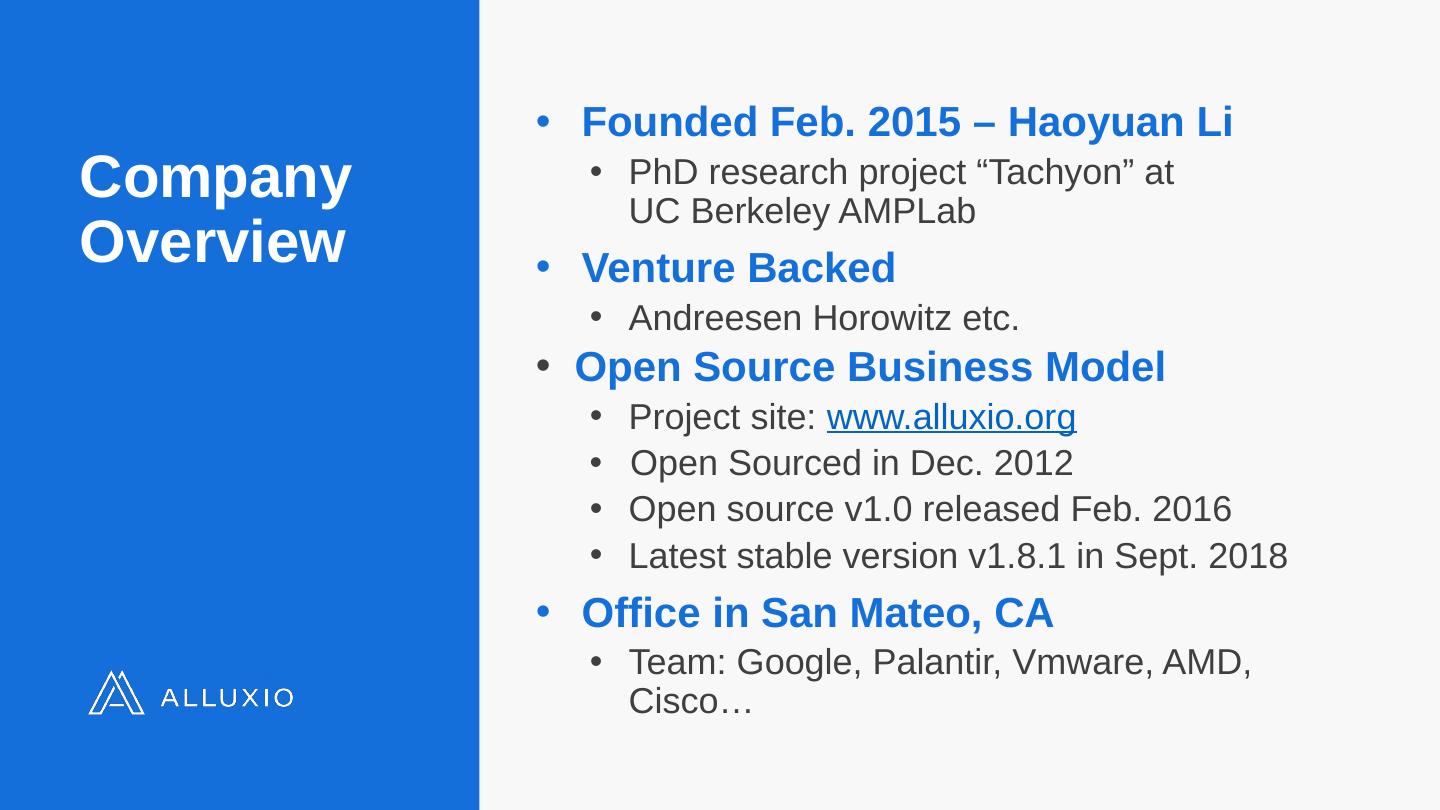 3 .Company Overview Founded Feb. 2015 – Haoyuan Li PhD research project “Tachyon” at UC Berkeley AMPLab Venture Backed Andreesen Horowitz etc. Open Source Business Model Project site: www.alluxio.org Open Sourced in Dec. 2012 Open source v1.0 released Feb. 2016 Latest stable version v1.8.1 in Sept. 2018 Office in San Mateo, CA Team: Google, Palantir , Vmware , AMD, Cisco…